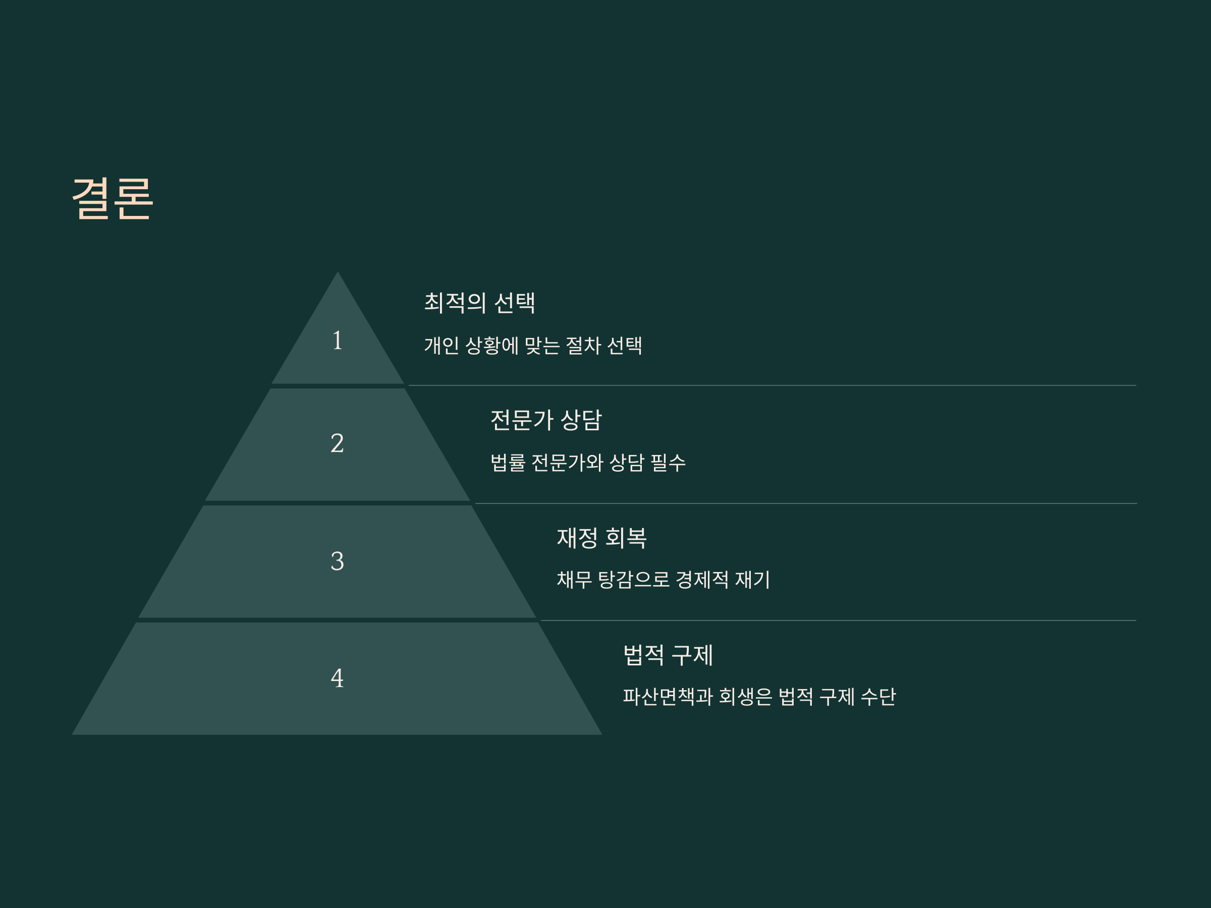 - 파산면책: 더 이상 채무를 갚을 능력이 없는 경우, 모든 채무를 면제받고 새로운 시작을 원할 때 적합합니다.