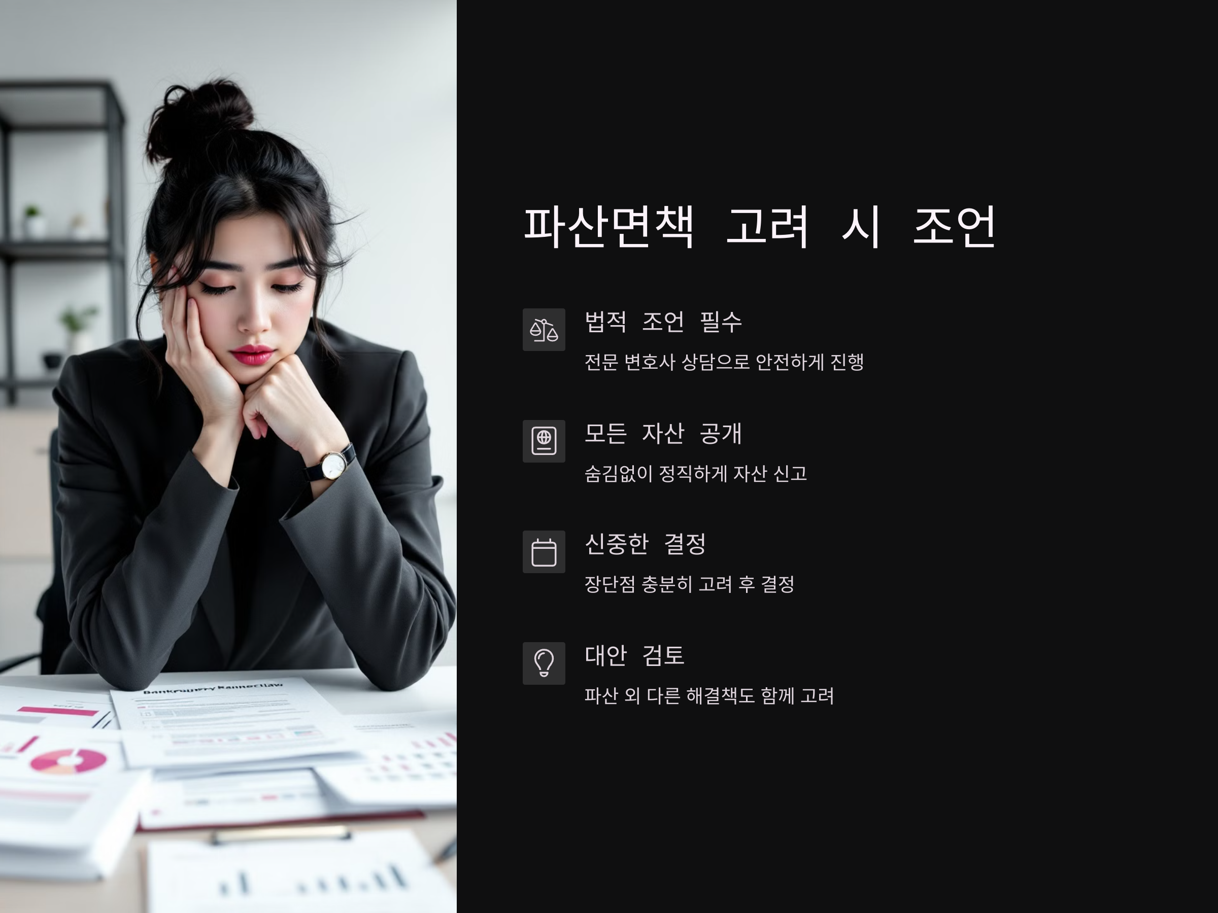 파산면책은 새로운 시작을 위한 중요한 기회일 수 있지만, 재산 보호와 관련된 사항을 충분히 고려한 후에 신중히 진행해야 합니다. 적절한 재산 보호를 위해서는 변호사나 전문가의 도움을 받는 것이 가장 안전합니다. 파산 후 재정 회복을 위한 계획도 반드시 수립하여 장기적으로 경제적 안정성을 확보하는 것이 중요합니다.