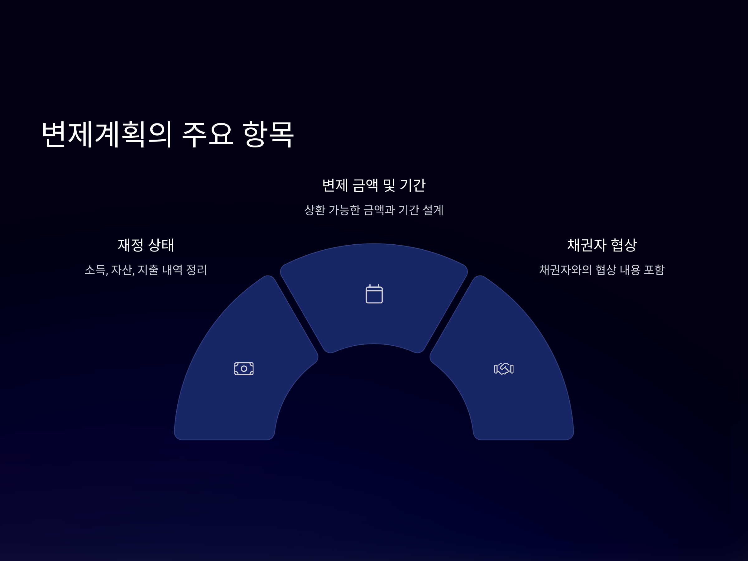 변제계획을 작성할 때 고려해야 할 주요 항목은 다음과 같습니다.