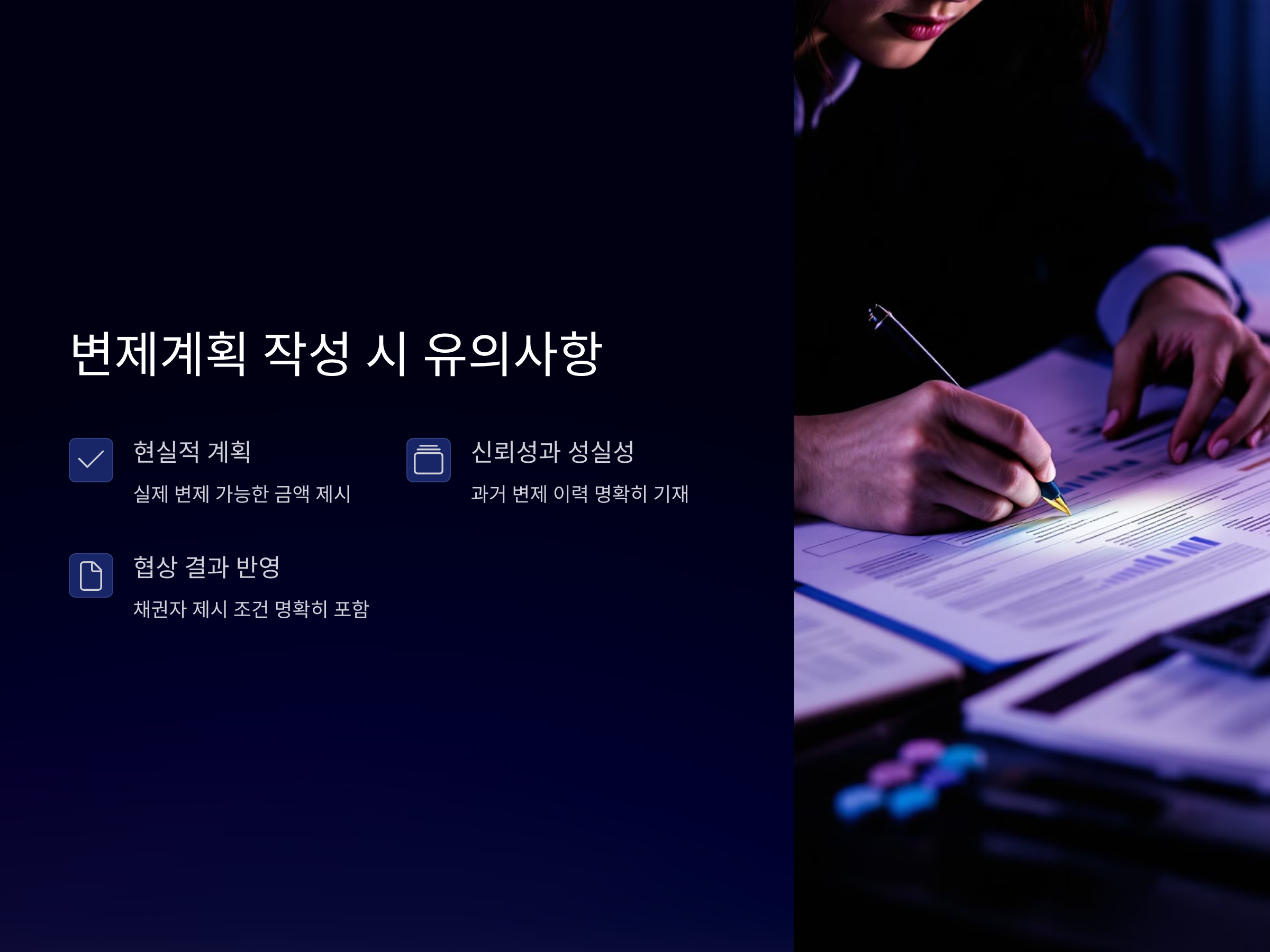변제계획을 작성할 때는 몇 가지 중요한 사항을 유의해야 합니다. 첫째, 계획은 현실적이어야 하며, 채무자가 실제로 변제할 수 있는 금액을 제시해야 합니다. 둘째, 법원은 채무자의 신뢰성과 성실성을 중요하게 평가하므로, 과거의 변제 이력을 명확히 밝히고, 변제 계획이 실현 가능한지를 명확하게 설명해야 합니다.