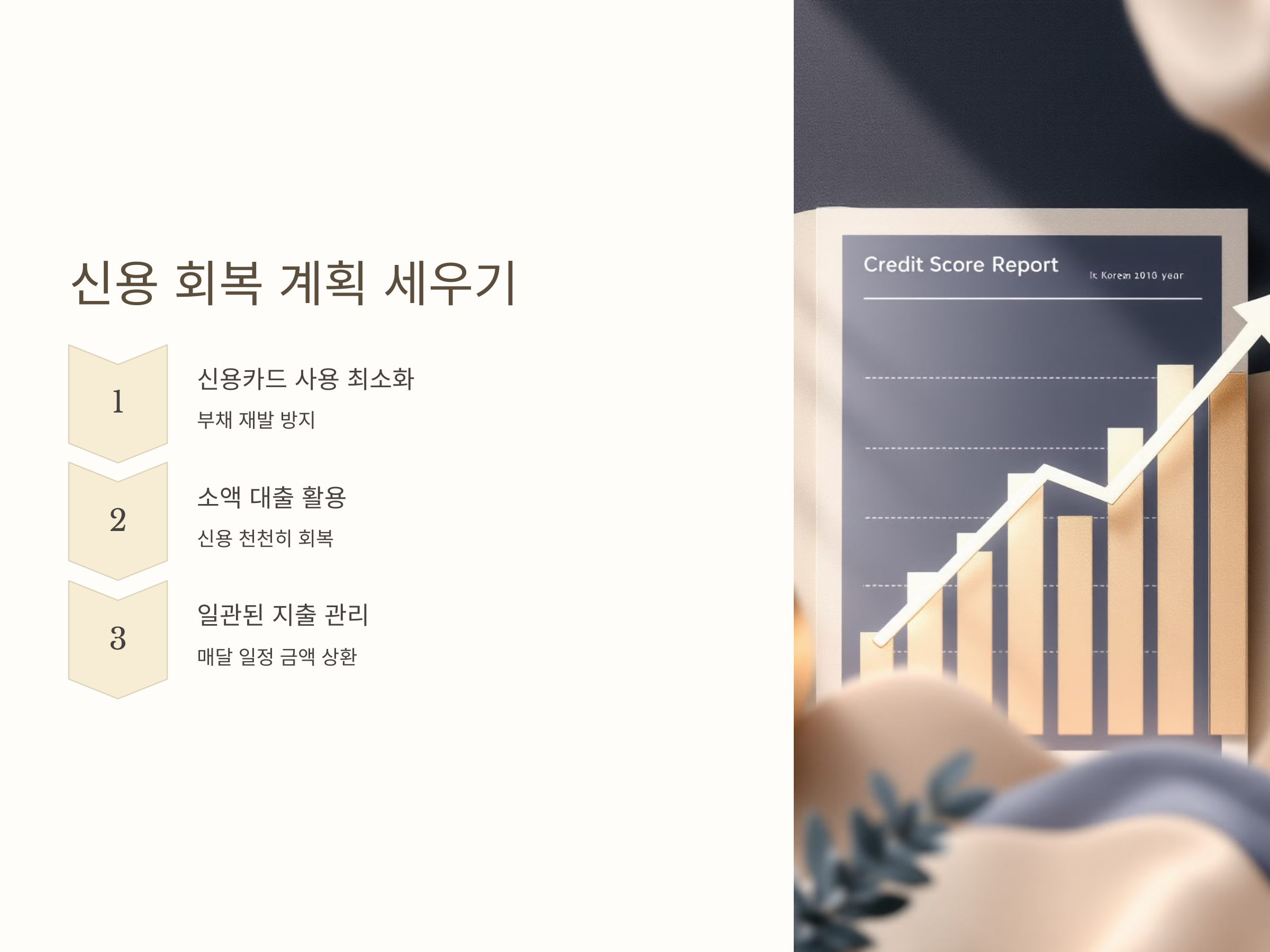 소액 대출을 이용할 수 있다면, 이를 활용하여 신용을 천천히 회복할 수 있습니다. 다만, 급하게 대출을 받거나 과도한 소비를 하지 않도록 주의해야 합니다. 신용 회복을 위한 가장 중요한 점은 일관되게 지출을 관리하고, 매달 일정한 금액을 상환하는 것입니다.