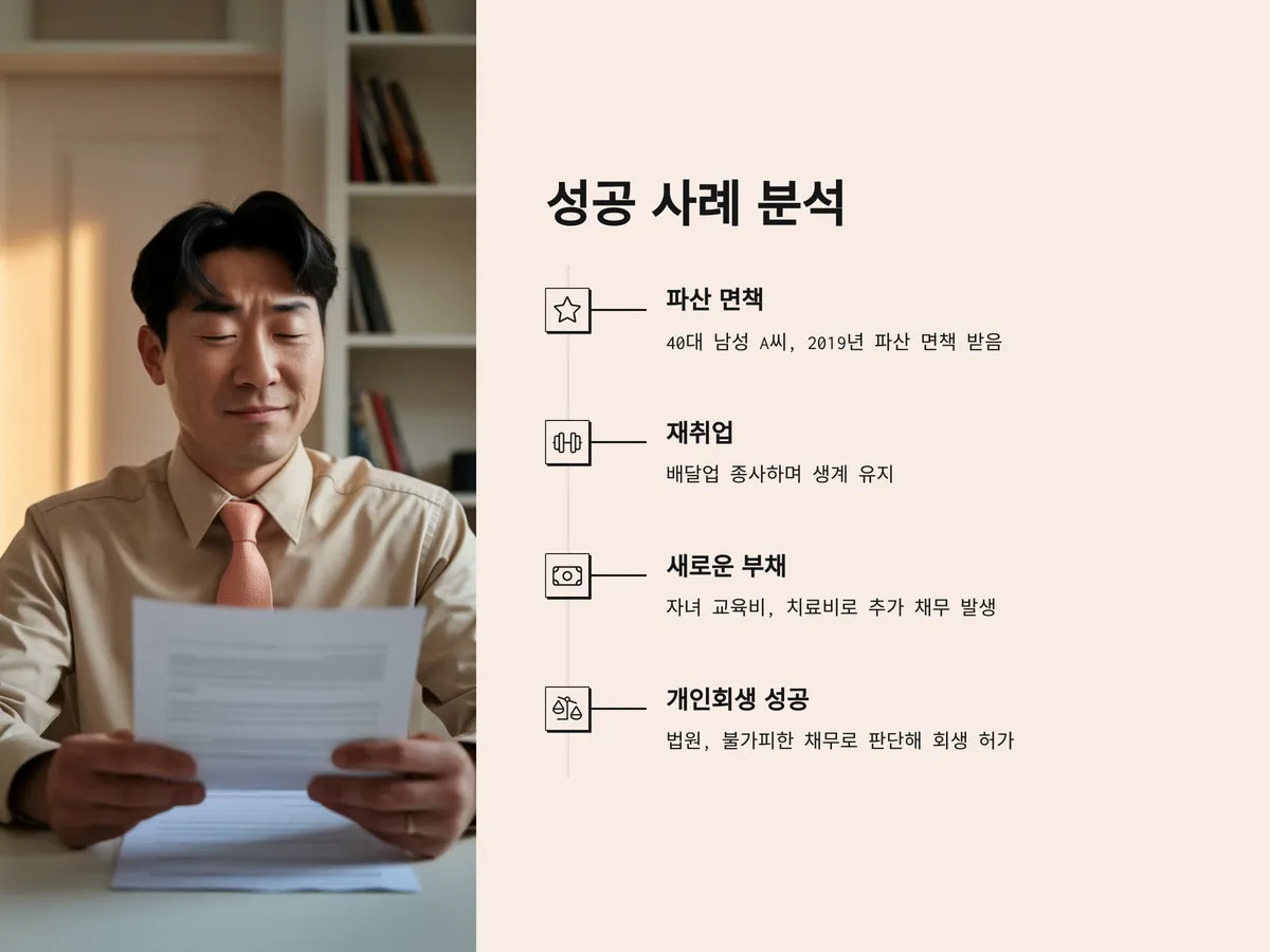 서울에 거주하는 40대 남성 A씨는 2019년 파산 면책을 받은 이후 배달업에 종사하며 다시 채무를 안게 되었습니다. 그는 자녀 교육비와 치료비로 인해 새로운 부채가 생겨 다시 법률구조공단의 도움을 받아 개인회생을 신청했습니다. 법원은 A씨의 새로운 채무가 불가피하다고 판단, 일정 금액을 상환하는 조건으로 회생을 허가했습니다.