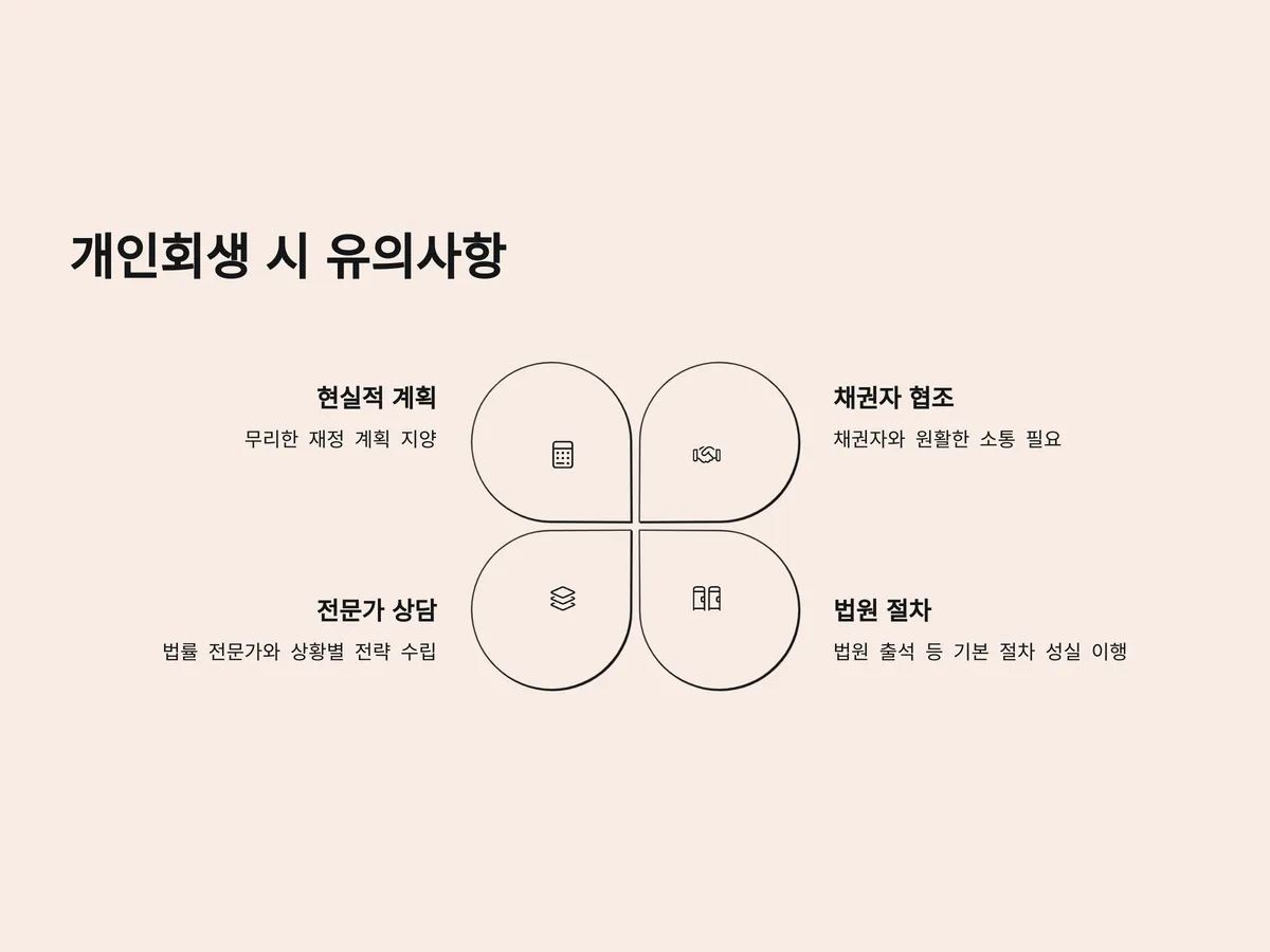 가장 중요한 것은 무리한 재정 계획을 세우지 않는 것입니다. 회생 절차를 시작한다고 해서 곧바로 모든 문제에서 해방되는 것이 아니므로, 회생기간 동안 꾸준히 상환을 이어갈 수 있는 현실적인 계획을 수립해야 합니다. 또한 채권자 협조, 법원 출석 등 기본적인 절차를 성실하게 이행하지 않으면 회생이 취소될 수도 있으므로 주의가 필요합니다.