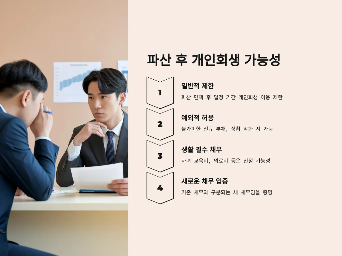 일반적으로 파산 면책을 받은 후에는 일정 기간 동안 개인회생 제도의 이용이 제한됩니다. 그러나 예외적으로 새로운 부채가 불가피하게 발생했거나, 사회경제적 상황이 급격히 악화되었을 경우, 법원의 판단에 따라 개인회생이 가능할 수 있습니다. 특히 자녀 교육비, 의료비, 생활비 등으로 인한 신규 채무는 생활의 불가피한 필요에 의한 것으로 간주되어 법원에서 일정 부분 받아들여질 수 있습니다.