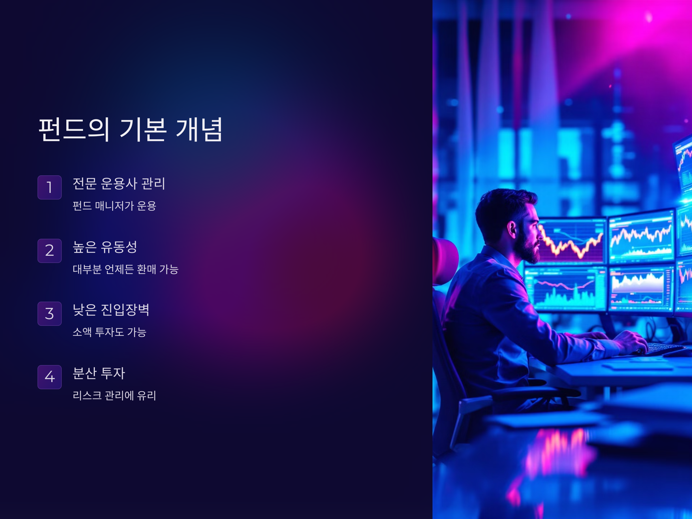 - 전문 운용사 관리: 개별 투자자가 직접 종목을 선택하지 않고, 펀드 매니저가 운용