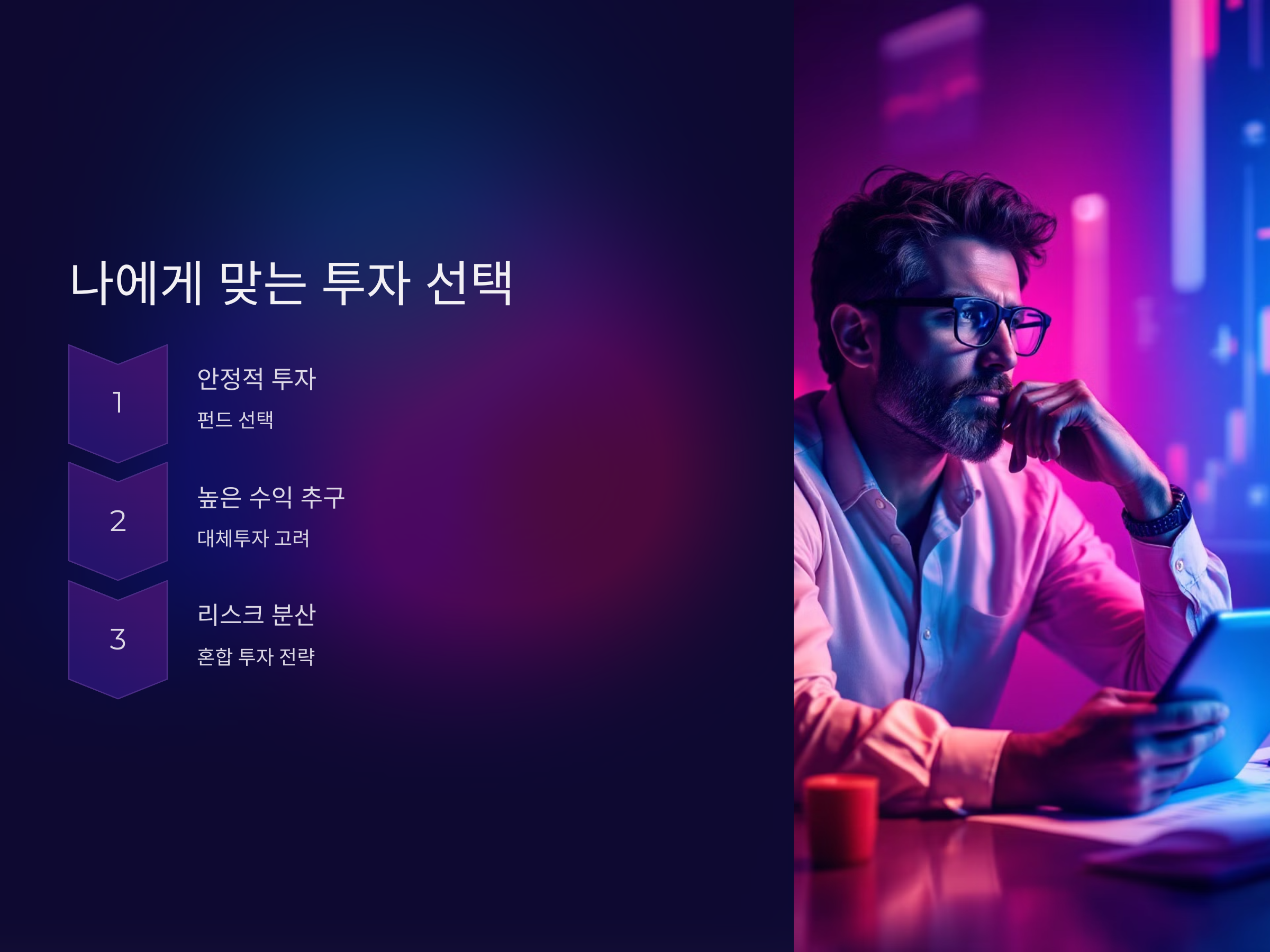 - 리스크를 분산하고 싶다면 → 펀드와 대체투자를 혼합 투자