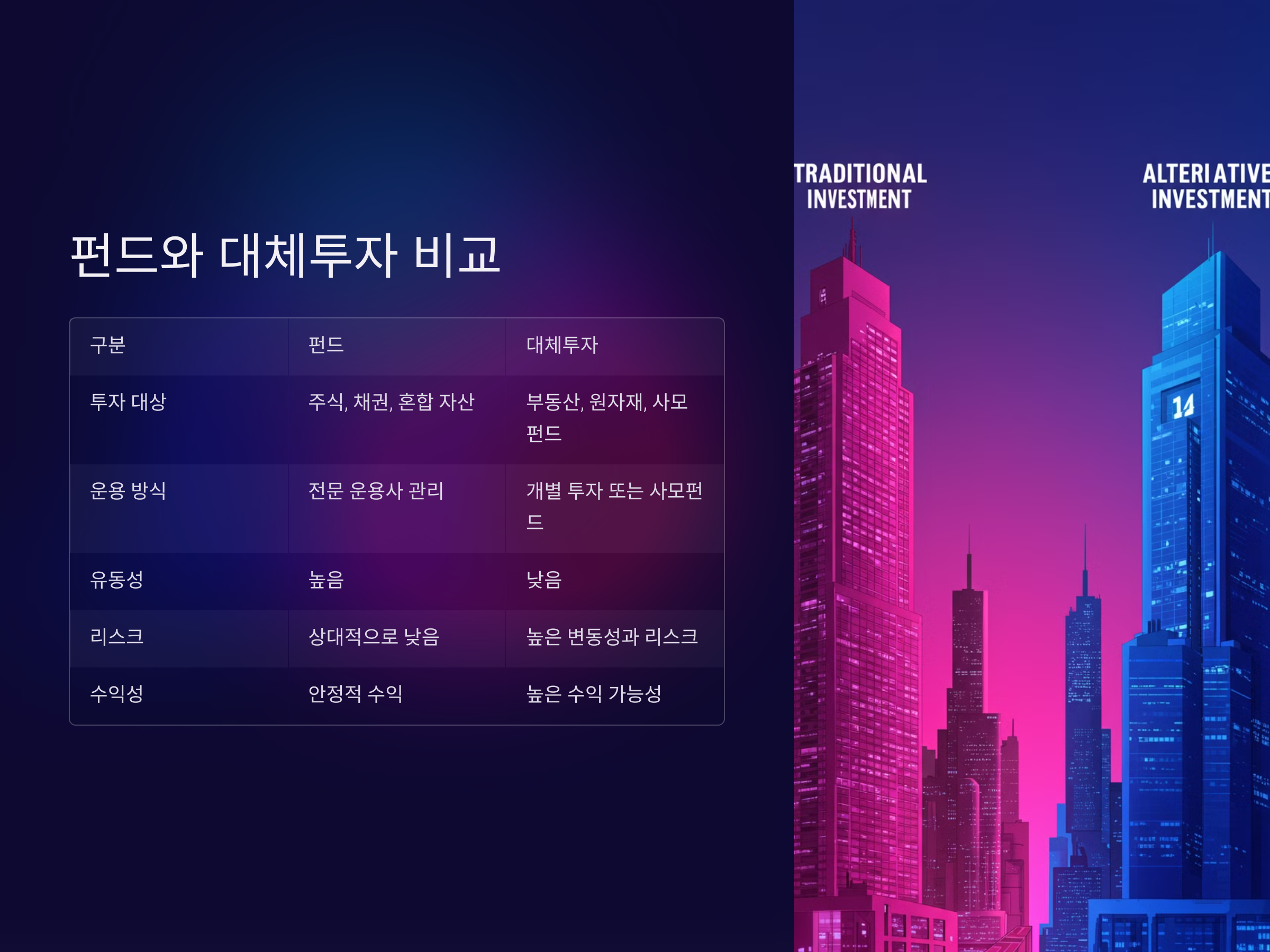 펀드는 유동성이 높고 변동성이 상대적으로 낮아 보수적인 투자자들에게 적합합니다. 반면, 대체투자는 장기적으로 높은 수익을 기대할 수 있지만 변동성이 크고 유동성이 낮아 신중한 접근이 필요합니다.