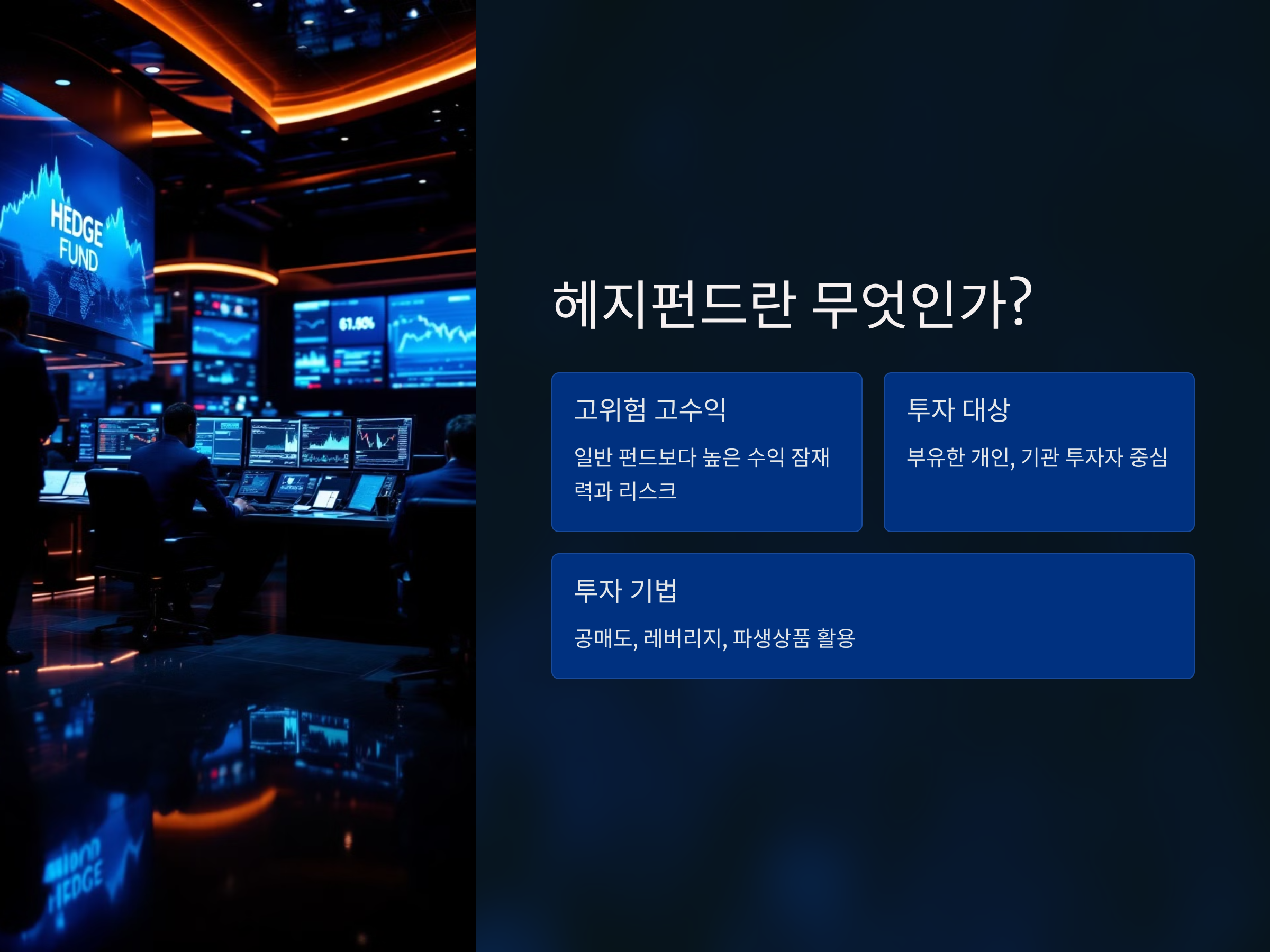헤지펀드는 단순히 주식이나 채권에만 투자하지 않고, 여러 가지 투자 기법을 사용합니다. 예를 들어, 공매도, 레버리지(자기 자본보다 더 큰 규모로 투자하는 방식), 파생상품을 이용한 투자를 통해 리스크를 관리하면서 수익을 추구하는 전략을 사용합니다. 이로 인해 헤지펀드는 일반적인 펀드보다 높은 수익을 낼 수 있는 잠재력을 가지고 있지만, 그만큼 리스크도 큽니다.