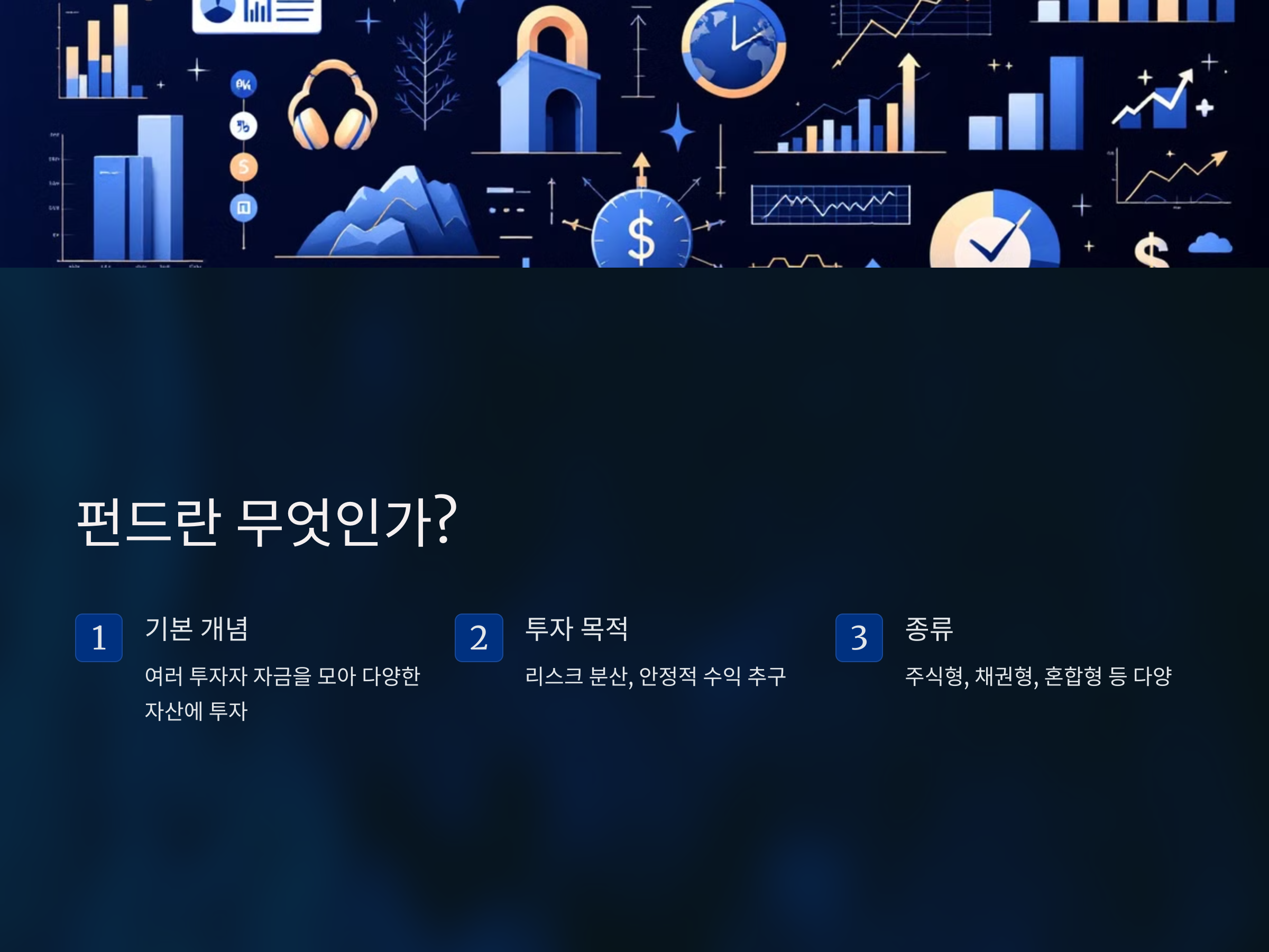 펀드는 여러 투자자들의 자금을 모아 다양한 자산에 투자하는 금융 상품입니다. 기본적으로 펀드는 여러 주식, 채권, 부동산 등 다양한 자산을 포트폴리오로 구성하여 리스크를 분산시키는 전략을 취합니다. 일반적인 펀드는 투자자가 최소한의 리스크로 일정한 수익을 추구할 수 있도록 설계되어 있으며, 대부분의 펀드는 장기적인 투자를 전제로 합니다.