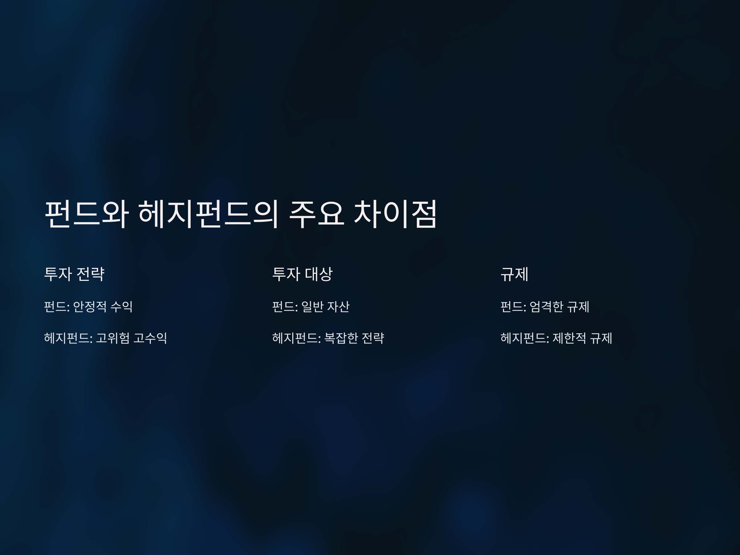 - 펀드는 주식, 채권, 부동산 등 다양한 자산에 투자하지만, 헤지펀드는 공매도, 레버리지 등을 활용하여 복잡한 투자 전략을 사용합니다.