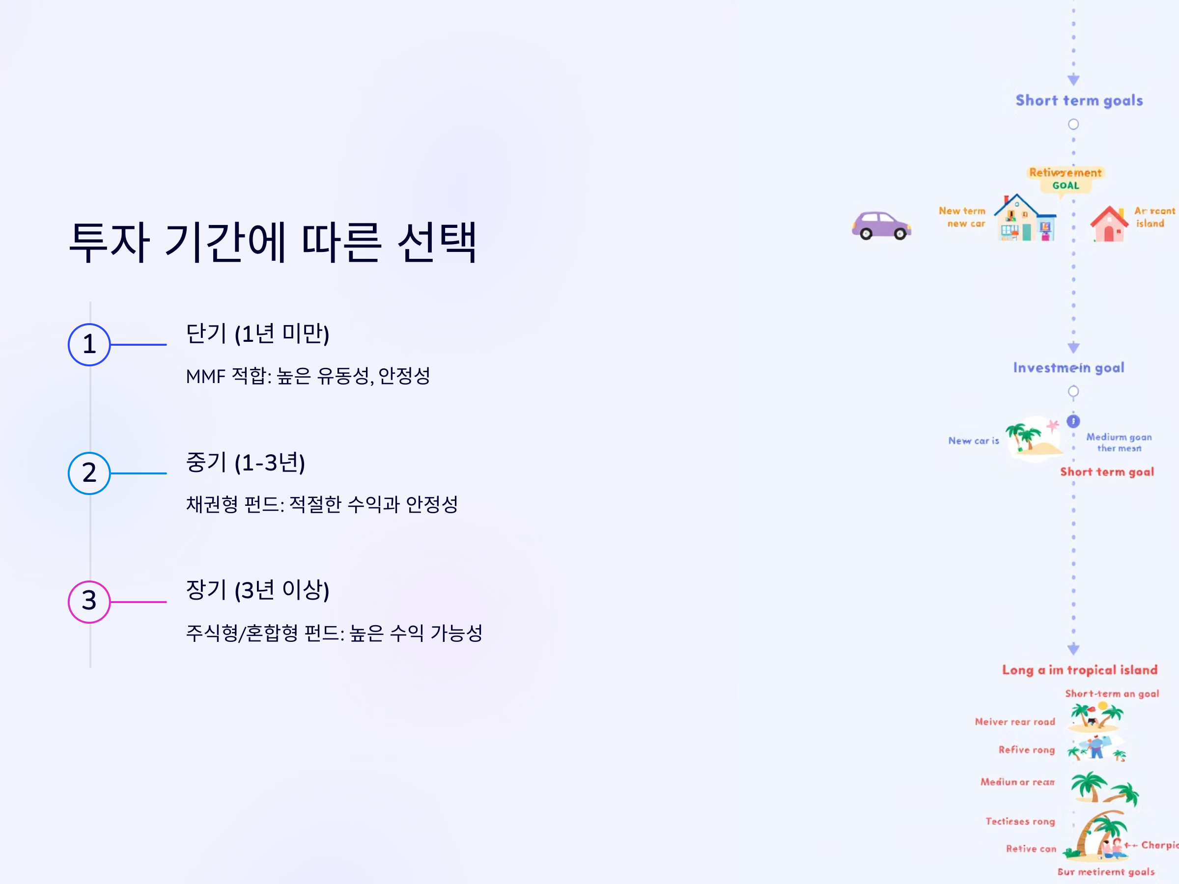- 투자 기간: 펀드는 일반적으로 장기 투자를 목적으로 하며, 몇 년 이상의 투자 기간을 설정할 수 있습니다. 반면, MMF는 단기 투자에 적합하여, 대부분 1년 이하의 투자 기간을 목표로 합니다.
