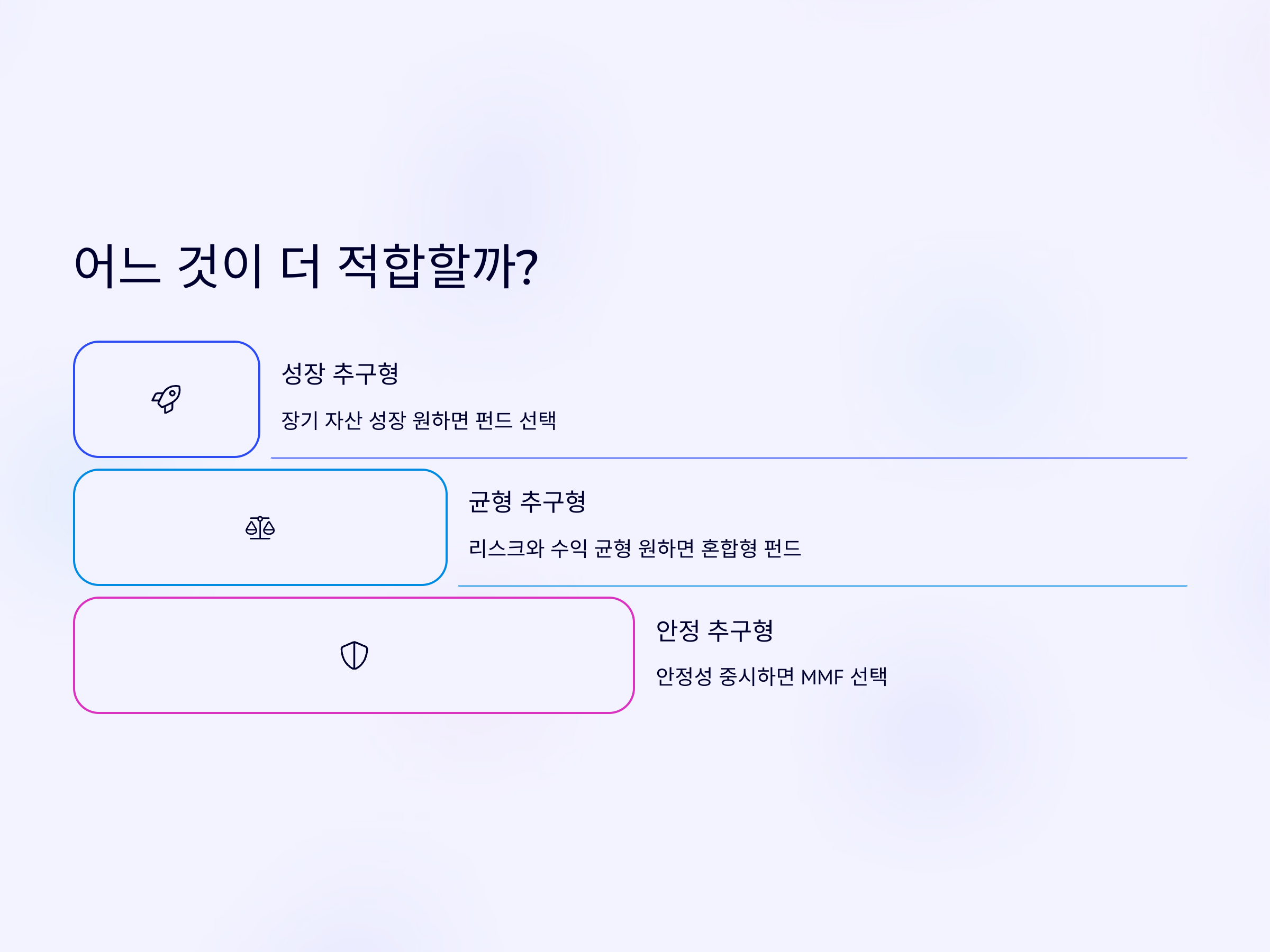 펀드와 MMF는 각기 다른 투자 성향에 맞춰 선택할 수 있는 상품입니다. 만약 장기적인 자산 성장과 높은 수익을 원한다면 펀드가 더 적합할 수 있습니다. 특히 주식형 펀드나 혼합형 펀드는 높은 리스크를 감수하는 대신 높은 수익을 추구하는 투자자에게 좋습니다.