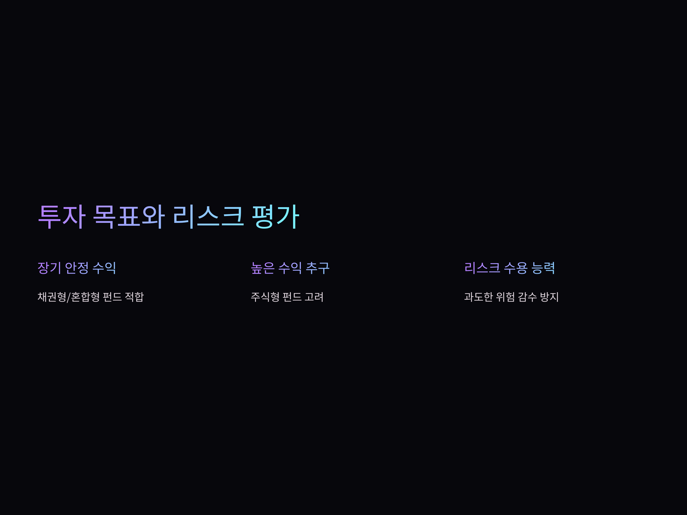 펀드를 선택할 때 가장 중요한 것은 투자 목표와 리스크 수용 능력입니다. 각 펀드는 자신이 추구하는 투자 목표와 리스크 수준에 따라 수익률이 달라지므로, 이를 충분히 이해하는 것이 필수적입니다. 예를 들어, 장기적으로 안정적인 수익을 목표로 한다면 채권형 펀드나 혼합형 펀드가 적합할 수 있습니다. 반면, 더 높은 수익을 추구한다면 주식형 펀드를 고려할 수 있습니다.