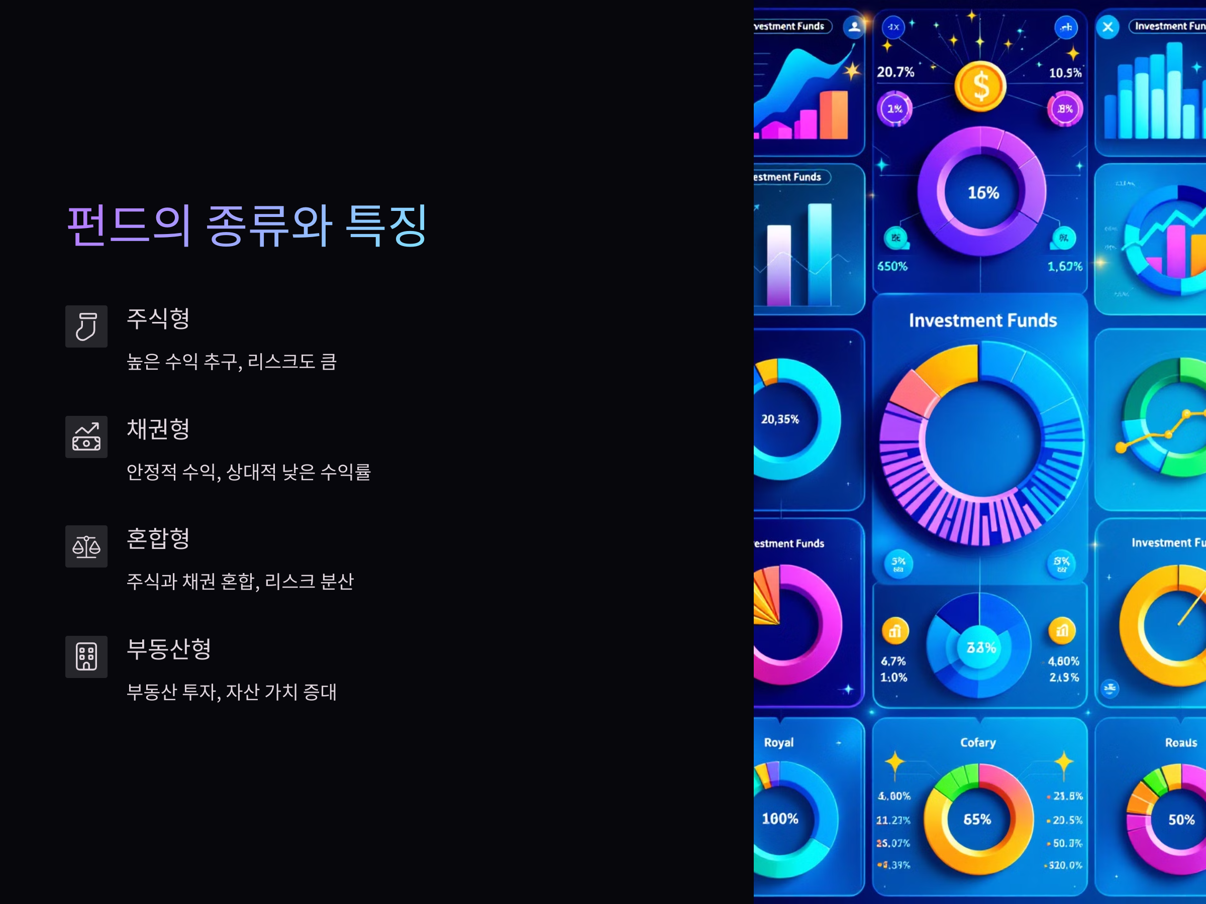 펀드는 크게 주식형, 채권형, 혼합형, 부동산형 등 다양한 종류가 있습니다. 각각의 펀드가 투자하는 자산군이 다르기 때문에, 자신이 어떤 펀드를 가입할지 결정하는 것이 중요합니다. 예를 들어, 주식형 펀드는 주식에 주로 투자하며 높은 수익을 추구하지만, 그만큼 리스크도 큽니다. 반면, 채권형 펀드는 안정적인 수익을 추구하지만 수익률은 상대적으로 낮습니다.