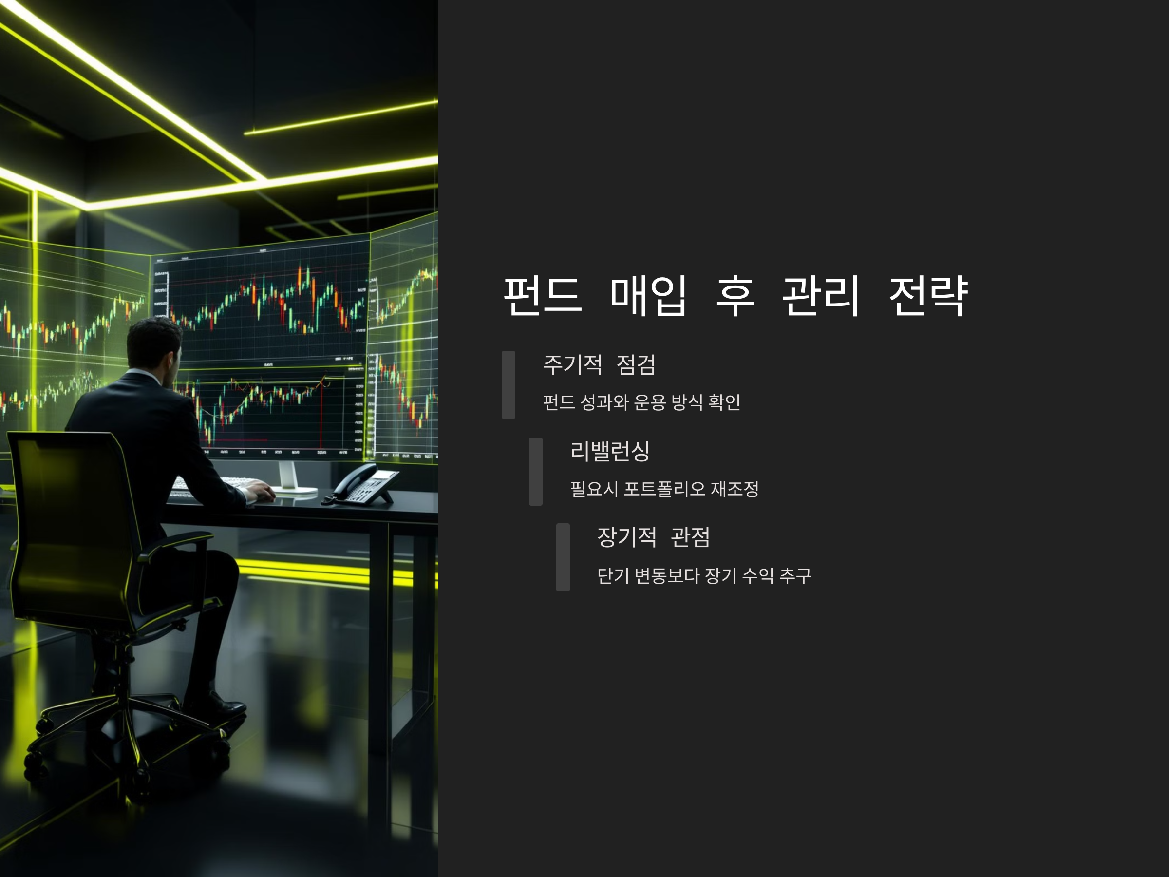 펀드 매입 후에는 단기적인 시장 변동에 영향을 받기보다는 장기적인 수익을 목표로 꾸준히 관리하는 것이 중요합니다. 관리가 제대로 이루어진다면, 시장의 변동성에도 불구하고 안정적인 수익을 얻을 수 있습니다.
