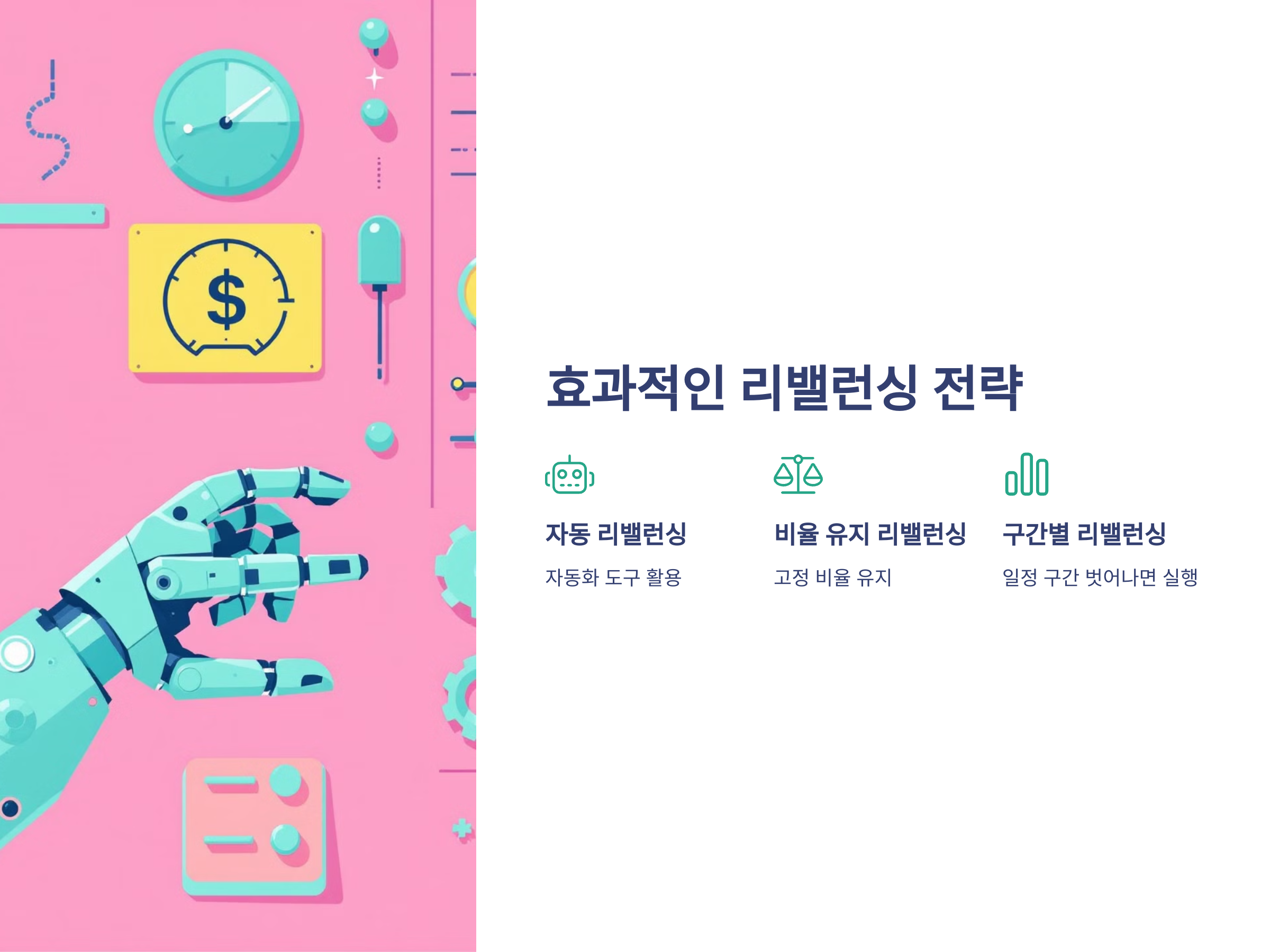 - 자동 리밸런싱: 자동화된 리밸런싱 도구나 소프트웨어를 활용하여, 미리 설정한 기준에 맞춰 자동으로 자산 배분을 조정할 수 있습니다. 이는 거래 비용을 줄이면서, 꾸준히 리밸런싱을 진행할 수 있는 방법입니다.