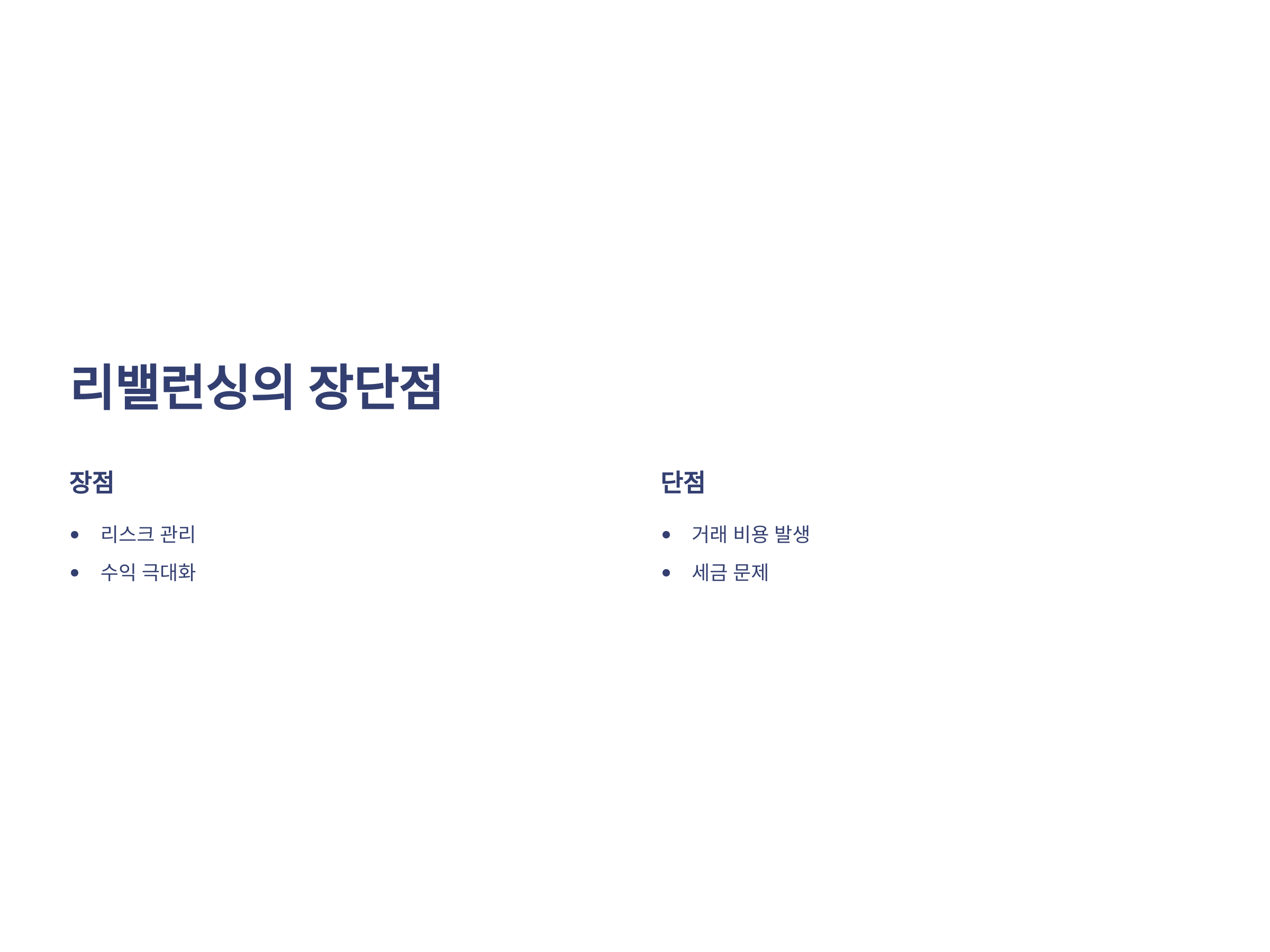 - 세금 문제: 리밸런싱을 통해 발생한 이익에 대해 세금이 부과될 수 있으므로, 세금 문제도 고려해야 합니다.