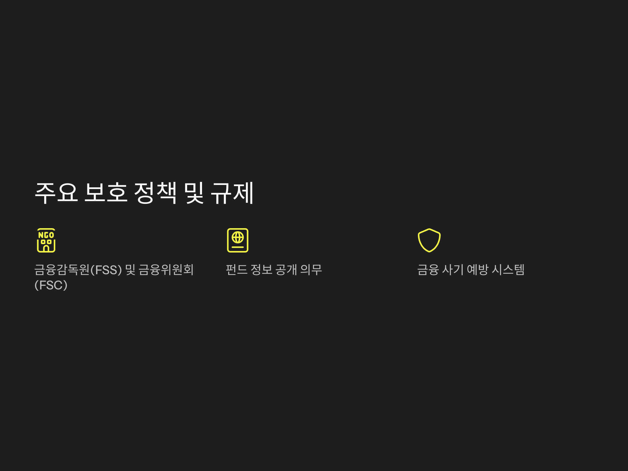 펀드 투자자 보호 정책에는 금융 사기를 예방하기 위한 다양한 시스템도 포함됩니다. 예를 들어, 투자자가 사기성 펀드에 투자하지 않도록 하기 위해, 금융감독원은 펀드의 등록 여부를 확인하고, 불법적으로 운영되는 펀드에 대한 규제를 강화합니다.