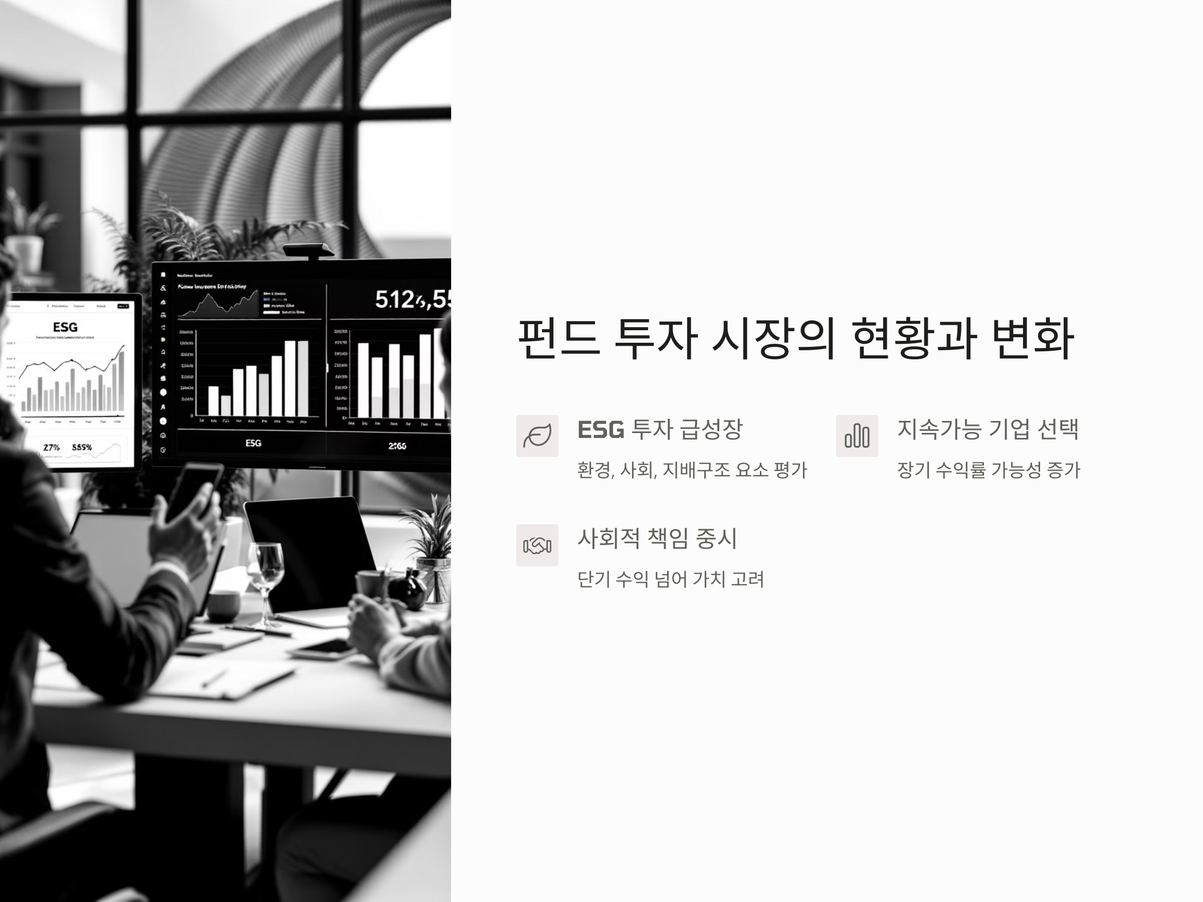 2025년 펀드 투자 시장은 기존의 전통적인 투자 방식에서 벗어나 다양한 변화를 겪고 있습니다. 특히, ESG 투자와 관련된 펀드의 급성장은 최근 몇 년간 펀드 시장에서 두드러지게 나타난 특징 중 하나입니다. ESG 투자란 기업의 환경적, 사회적, 그리고 지배구조적 요소를 평가하여 투자하는 전략을 의미합니다. 최근 연구에서는 ESG 요소가 기업의 장기적인 성장과 지속 가능성에 중요한 영향을 미친다고 평가되고 있습니다.