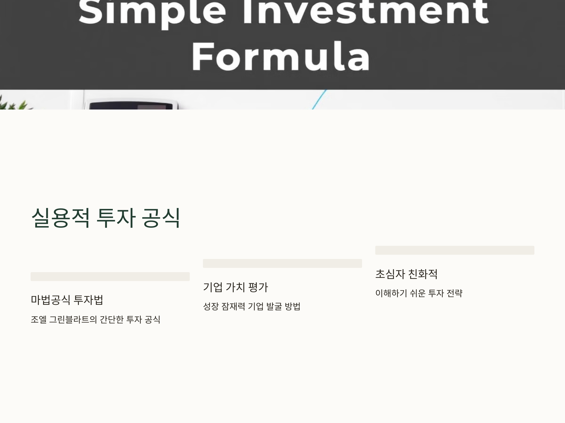 마법공식 투자법을 통해 기업 가치를 평가하고, 성장 잠재력이 큰 기업에 투자하는 간단한 투자 공식을 제시합니다. citeturn0search4