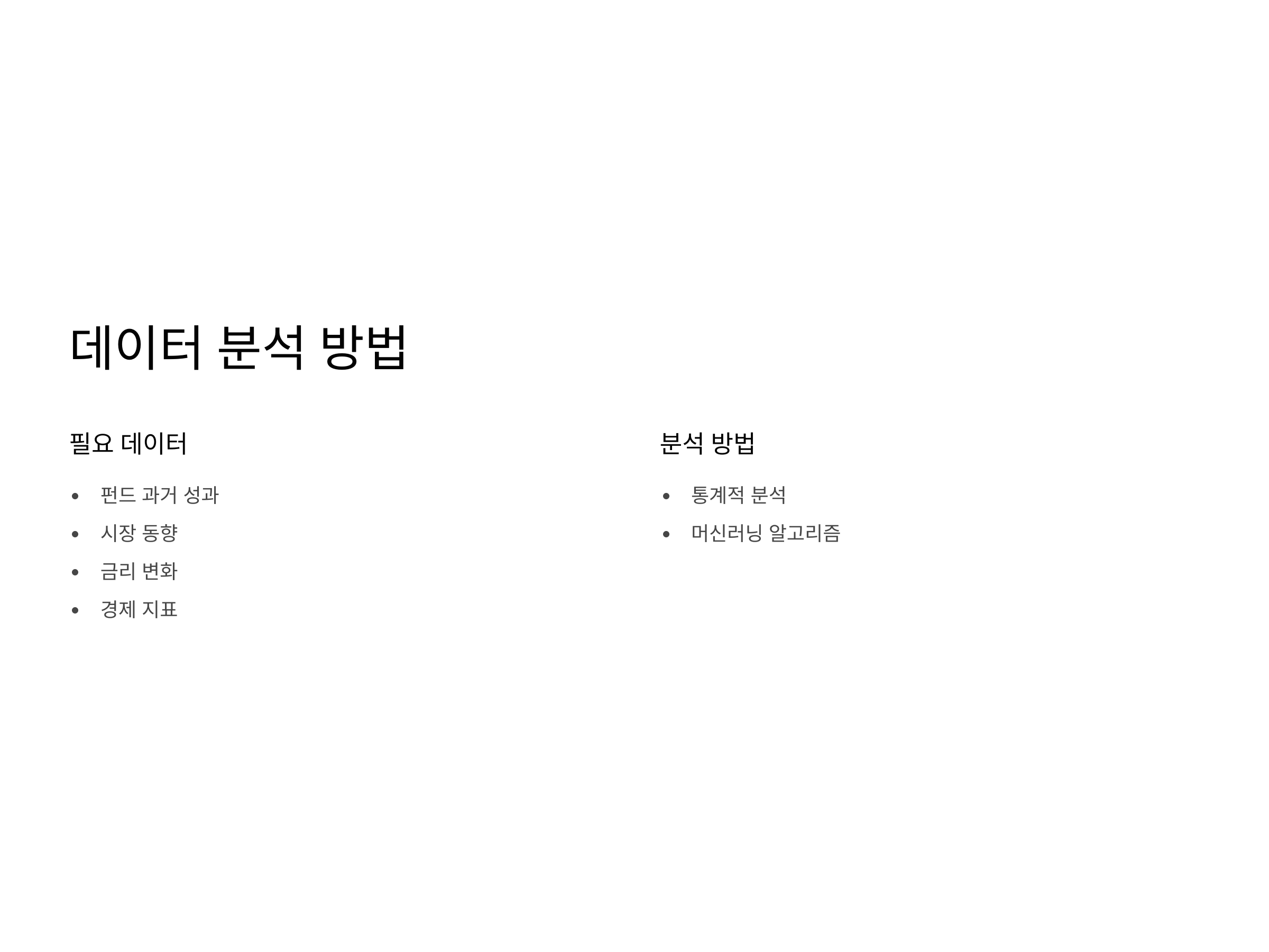 데이터 분석 방법은 크게 두 가지로 나눌 수 있습니다. 첫 번째는 전통적인 통계적 분석 방법으로, 펀드의 수익률, 표준편차, 상관관계 등을 분석하는 방법입니다. 두 번째는 머신러닝 알고리즘을 활용한 방법으로, 과거의 데이터와 다양한 변수를 학습하여 미래 성과를 예측하는 것입니다. 두 방법은 서로 보완적이며, 데이터의 특성에 맞게 적절히 조합하여 사용할 수 있습니다.