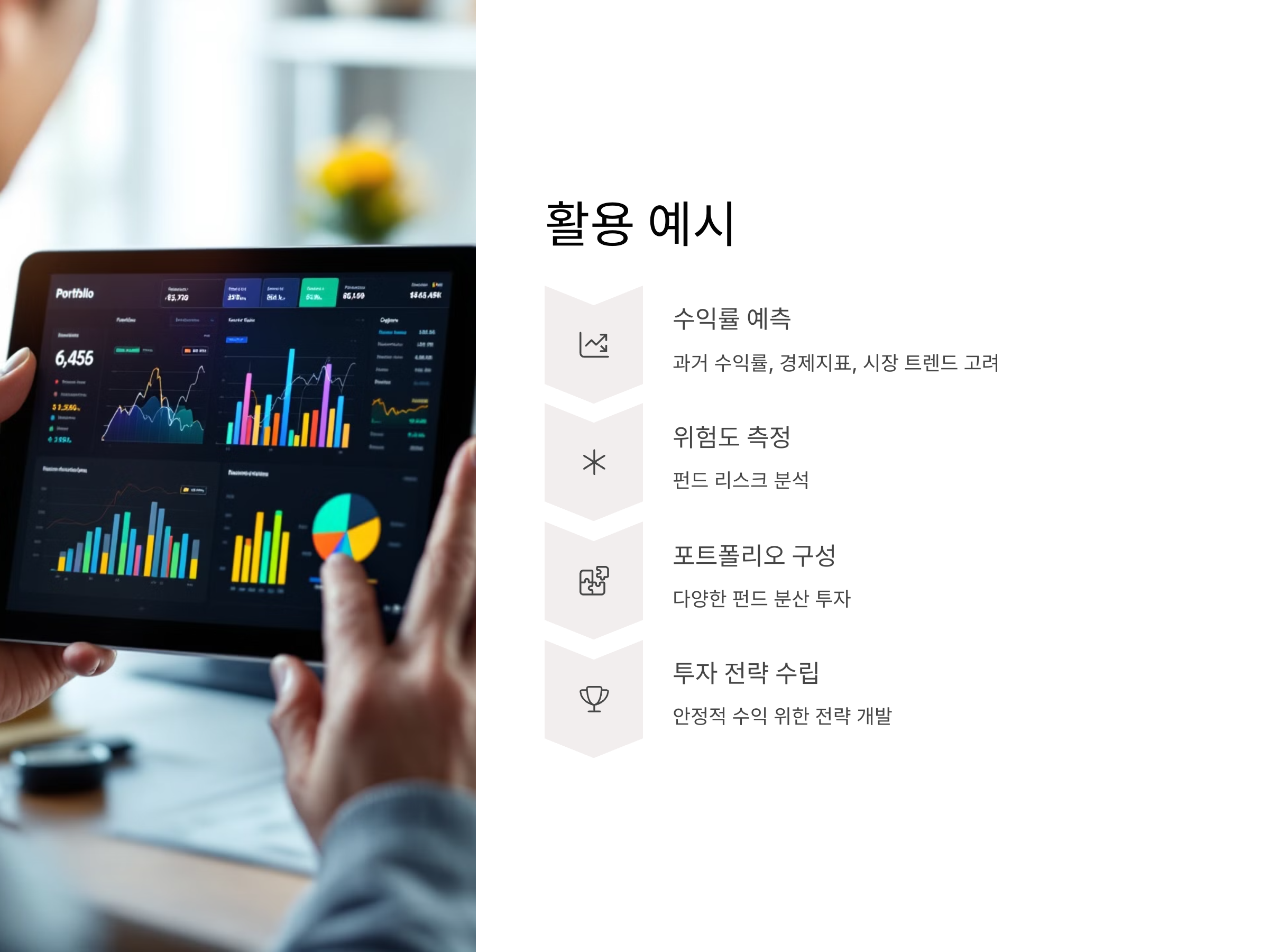 펀드 성과 예측 모델을 실제로 어떻게 활용할 수 있을까요? 한 가지 예시로는, 특정 펀드의 과거 수익률, 경제 지표, 시장 트렌드 등을 고려하여 그 펀드의 미래 수익률을 예측하고, 이를 다른 펀드들과 비교하는 방법이 있습니다. 이를 통해 투자자는 가장 높은 수익률을 기대할 수 있는 펀드를 선택할 수 있습니다.