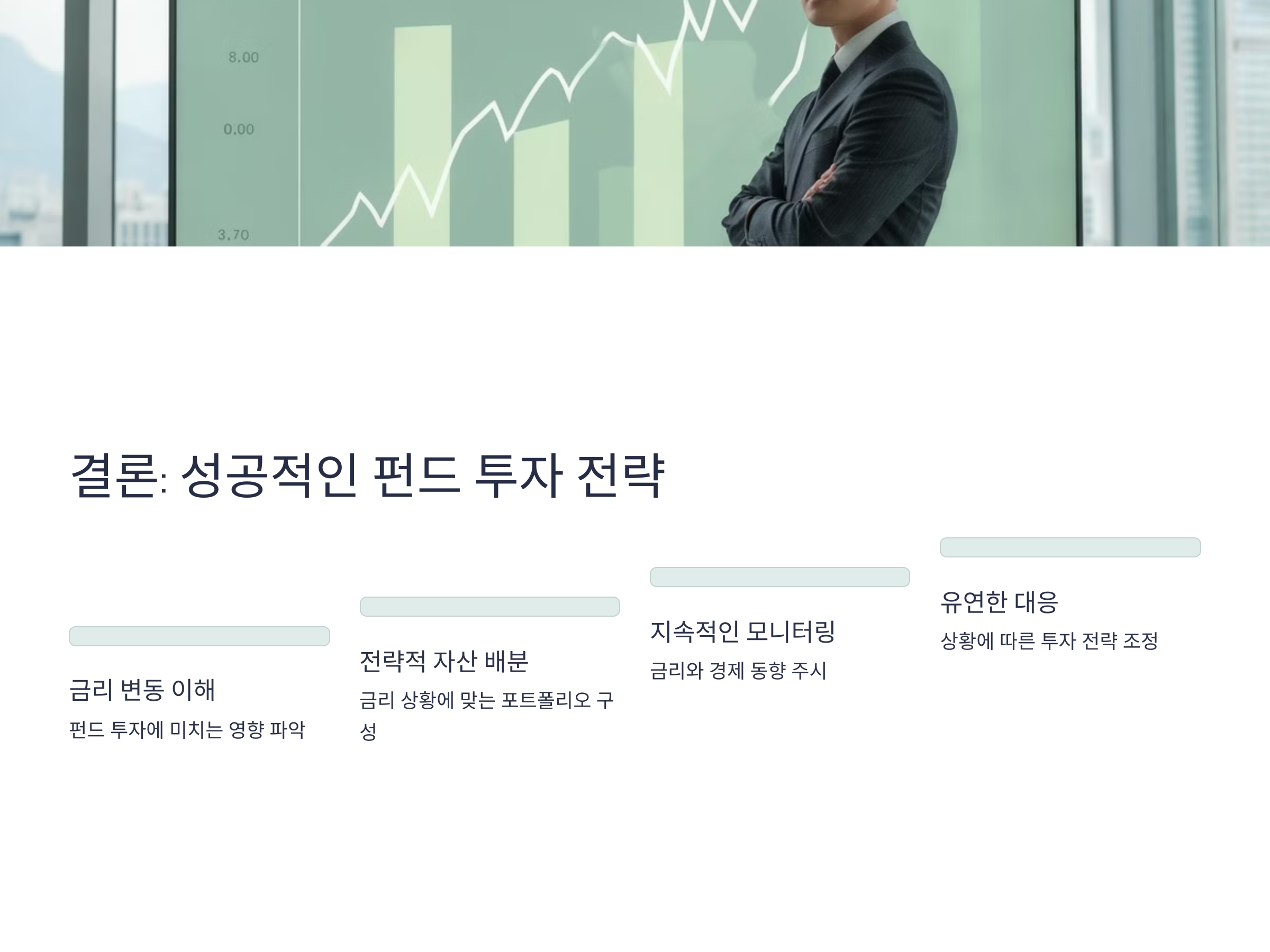 펀드 투자 시 금리 변동의 영향을 이해하고, 이에 맞춘 전략을 세우는 것이 중요합니다. 금리가 변동할 때마다 자산군과 투자 포트폴리오를 조정하여 리스크를 최소화하고, 안정적인 수익을 올릴 수 있는 방법을 찾는 것이 펀드 투자에서 성공적인 전략이 될 것입니다.