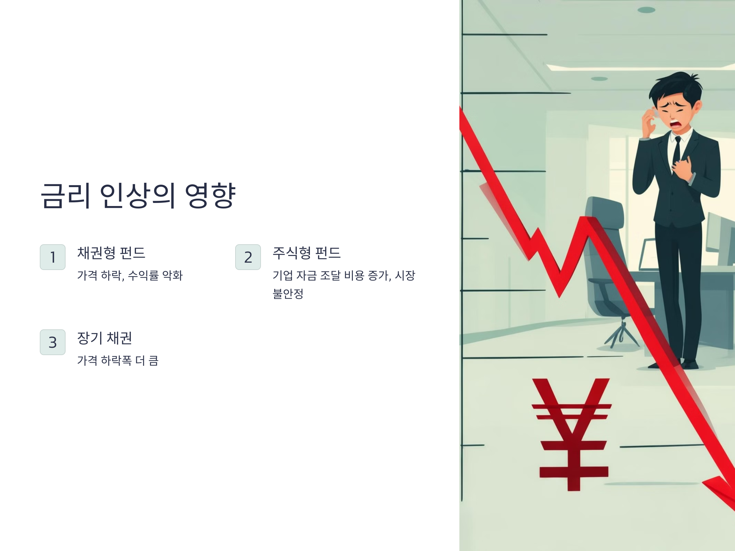 금리가 인상되면 채권형 펀드는 가격 하락의 위험이 커지고, 주식형 펀드도 기업 자금 조달 비용 증가로 인해 하락할 수 있습니다. 금리 인상 시에는 금리에 민감한 자산군에서 벗어나 분산 투자하는 것이 좋습니다.
