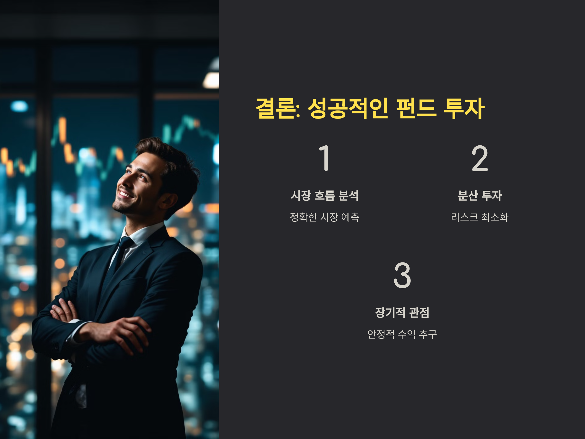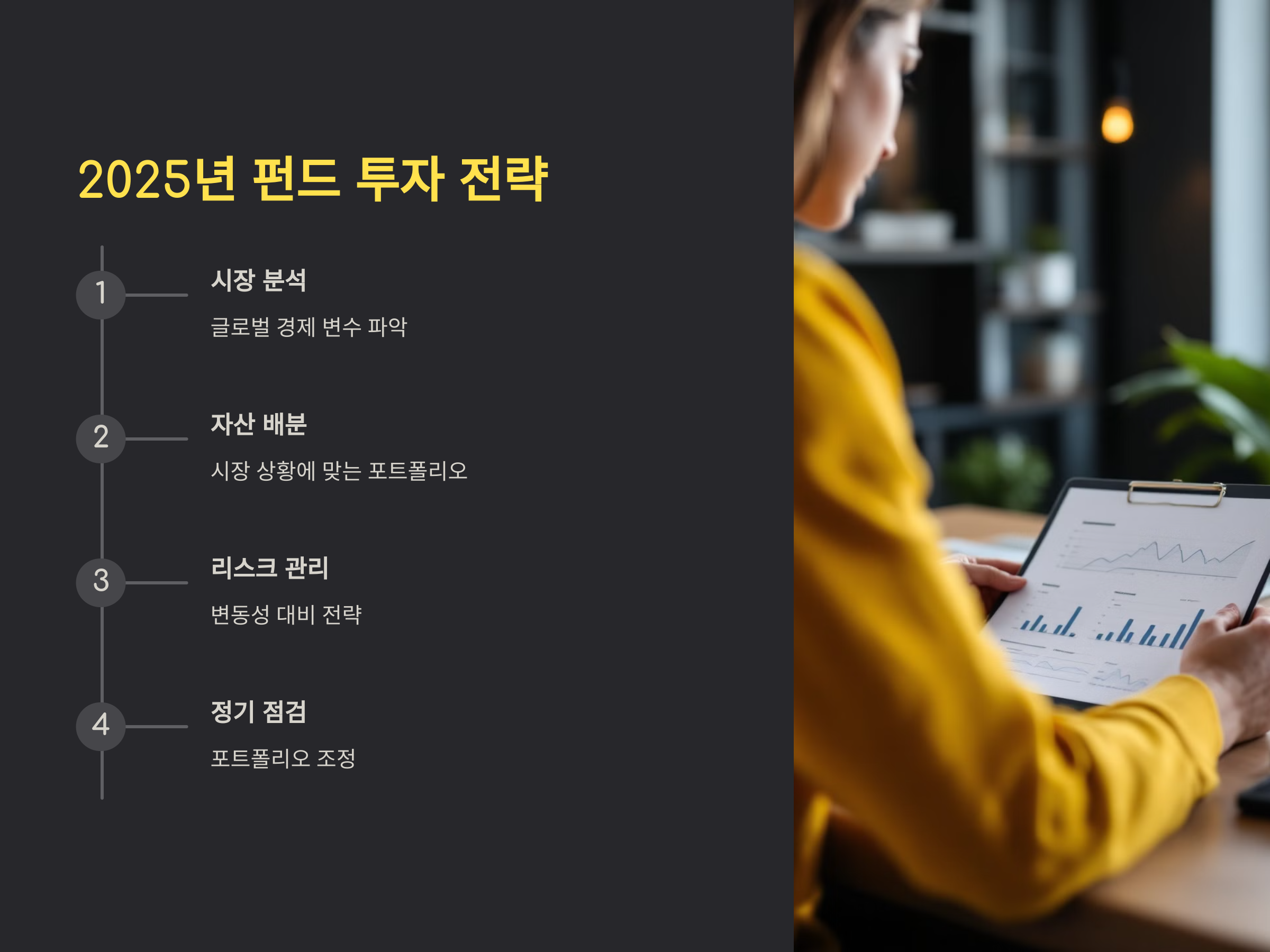 2025년 펀드 투자에서 중요한 것은 주식시장의 흐름을 정확히 분석하고, 그에 맞는 전략을 세우는 것입니다. 글로벌 경제의 불확실성과 금리 변동, 기업 실적 등의 여러 요인이 주식시장에 영향을 미칠 것입니다. 따라서 펀드 투자자는 이러한 변수들을 면밀히 분석하고, 분산 투자와 리스크 관리를 철저히 하여 안정적인 수익을 추구해야 합니다.