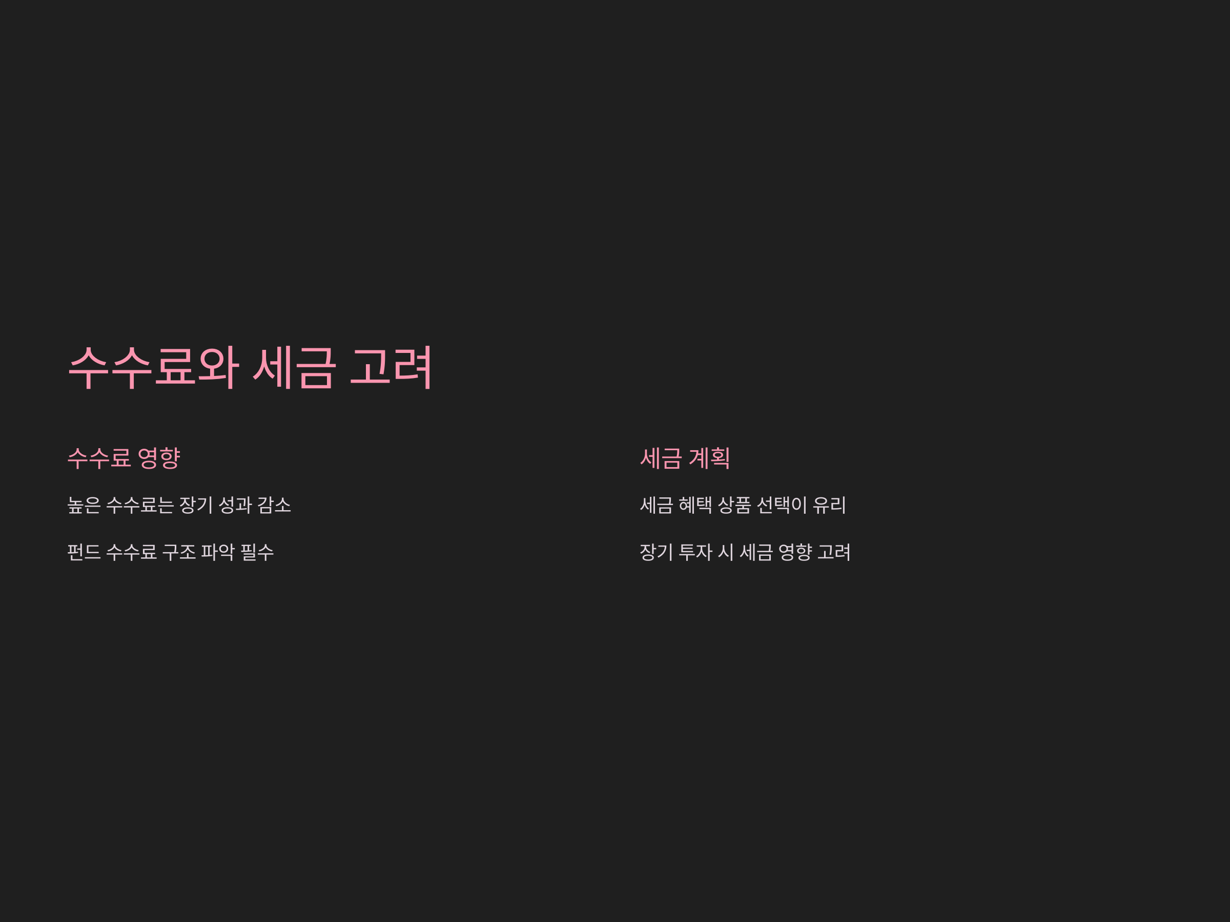 펀드 투자 시 수수료와 세금을 고려하는 것은 매우 중요합니다. 투자하려는 펀드의 수수료 구조를 파악하고, 세금에 대한 계획을 세워야 합니다. 특히, 장기 투자 시 세금의 영향을 고려하여 세금 혜택을 받을 수 있는 상품을 선택하는 것이 좋습니다.