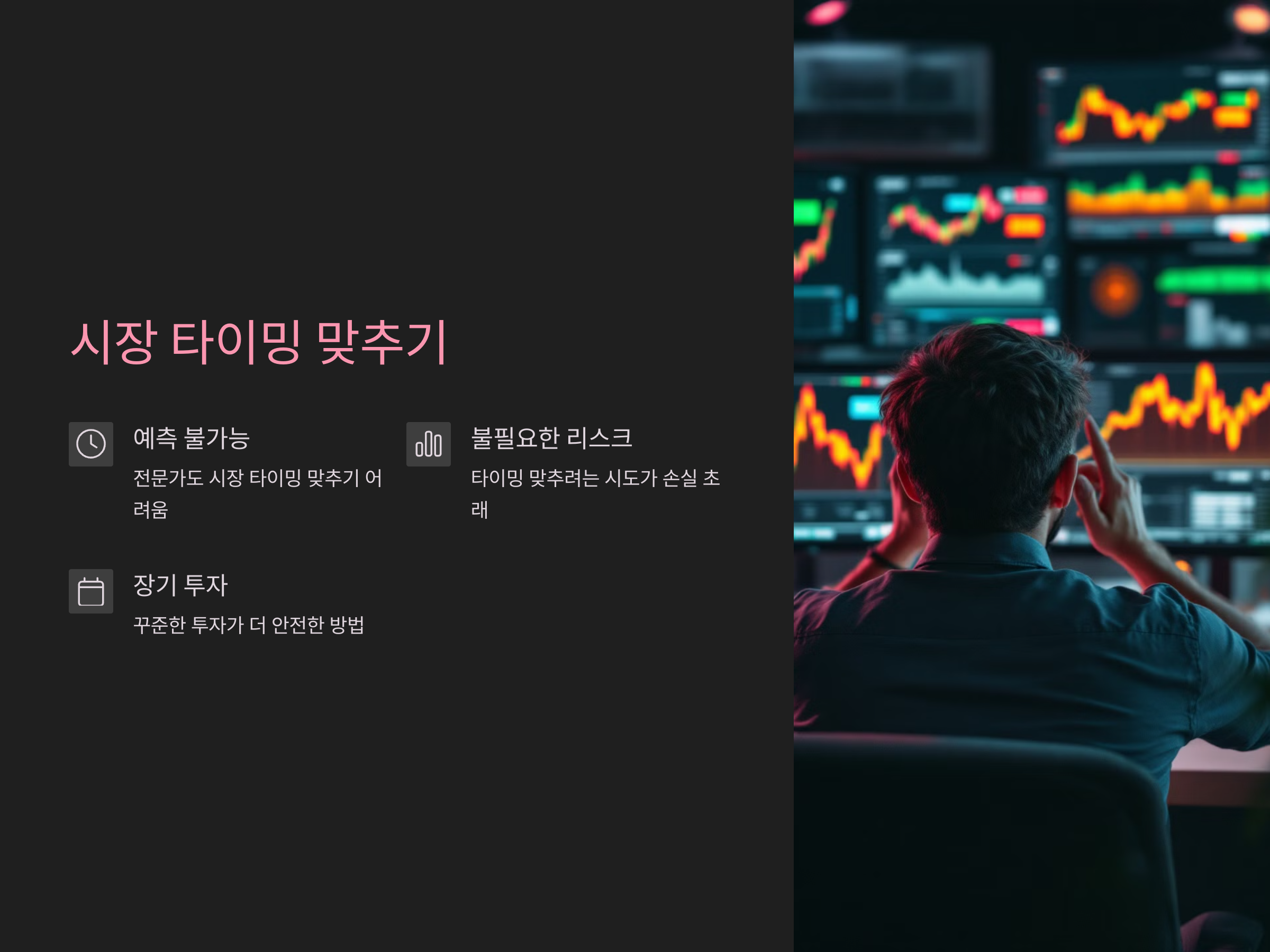 시장 타이밍을 맞추려는 시도는 불필요한 리스크를 초래할 수 있습니다. 주식 시장은 예측 불가능한 요소가 많기 때문에, 타이밍을 정확히 맞추는 것은 거의 불가능합니다. 대신, 장기적인 투자 계획을 세우고, 꾸준히 투자하는 것이 더 안전한 방법입니다.