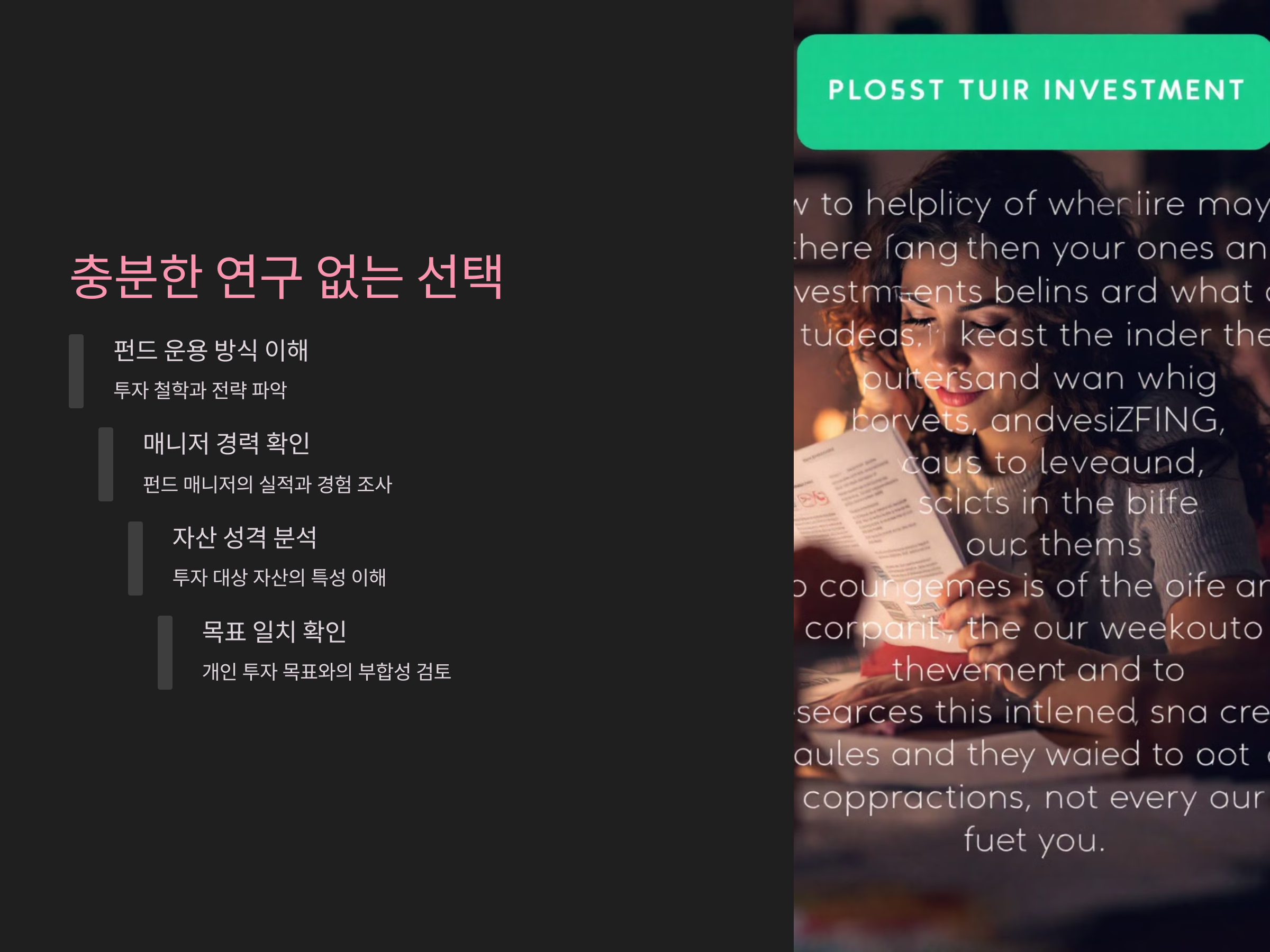 펀드를 선택할 때 충분한 연구 없이 투자 결정을 내리는 것도 큰 실수입니다. 많은 투자자들이 과도한 광고나 마케팅에 현혹되어 펀드를 선택하는 경우가 많습니다. 그러나 펀드를 선택할 때는 반드시 그 펀드의 운용 방식, 자산 배분 전략, 리스크 등을 면밀히 분석해야 합니다.