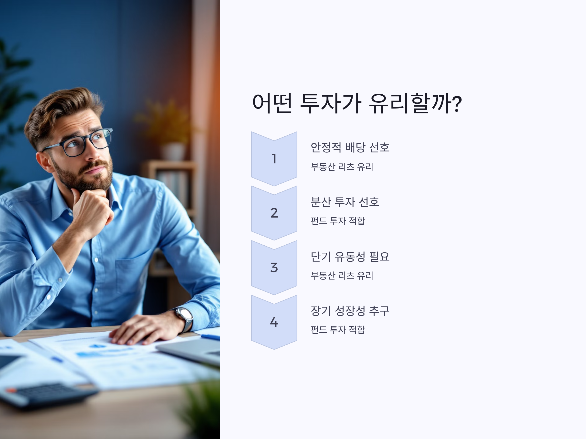 - 안정적인 배당을 원한다면? 부동산 리츠가 유리합니다. 정기적인 임대 수익을 기반으로 꾸준한 배당을 기대할 수 있습니다.