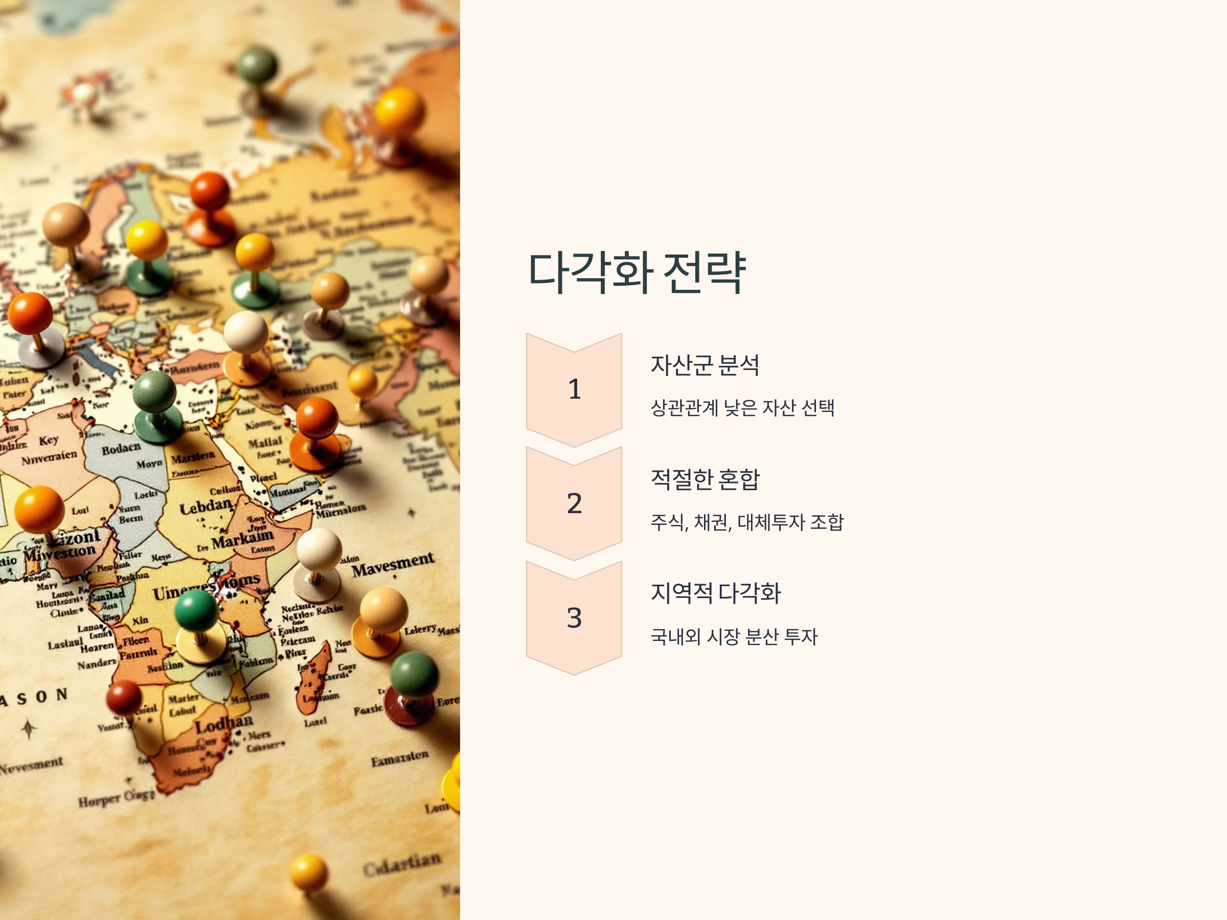 다각화 전략을 잘 구축하기 위해서는 자산군 간 상관관계를 분석하고, 위험을 분산할 수 있는 자산들을 선택하는 것이 중요합니다. 기본적으로 포트폴리오는 주식, 채권, 대체투자(부동산, 원자재 등) 등을 포함하는 것이 바람직합니다. 각 자산군의 상관관계가 낮을수록 다각화 효과가 커집니다. 예를 들어, 주식과 채권은 역사적으로 상관관계가 낮은 편이므로 이 두 자산군을 적절히 혼합하는 전략은 위험을 잘 분산시킬 수 있습니다.