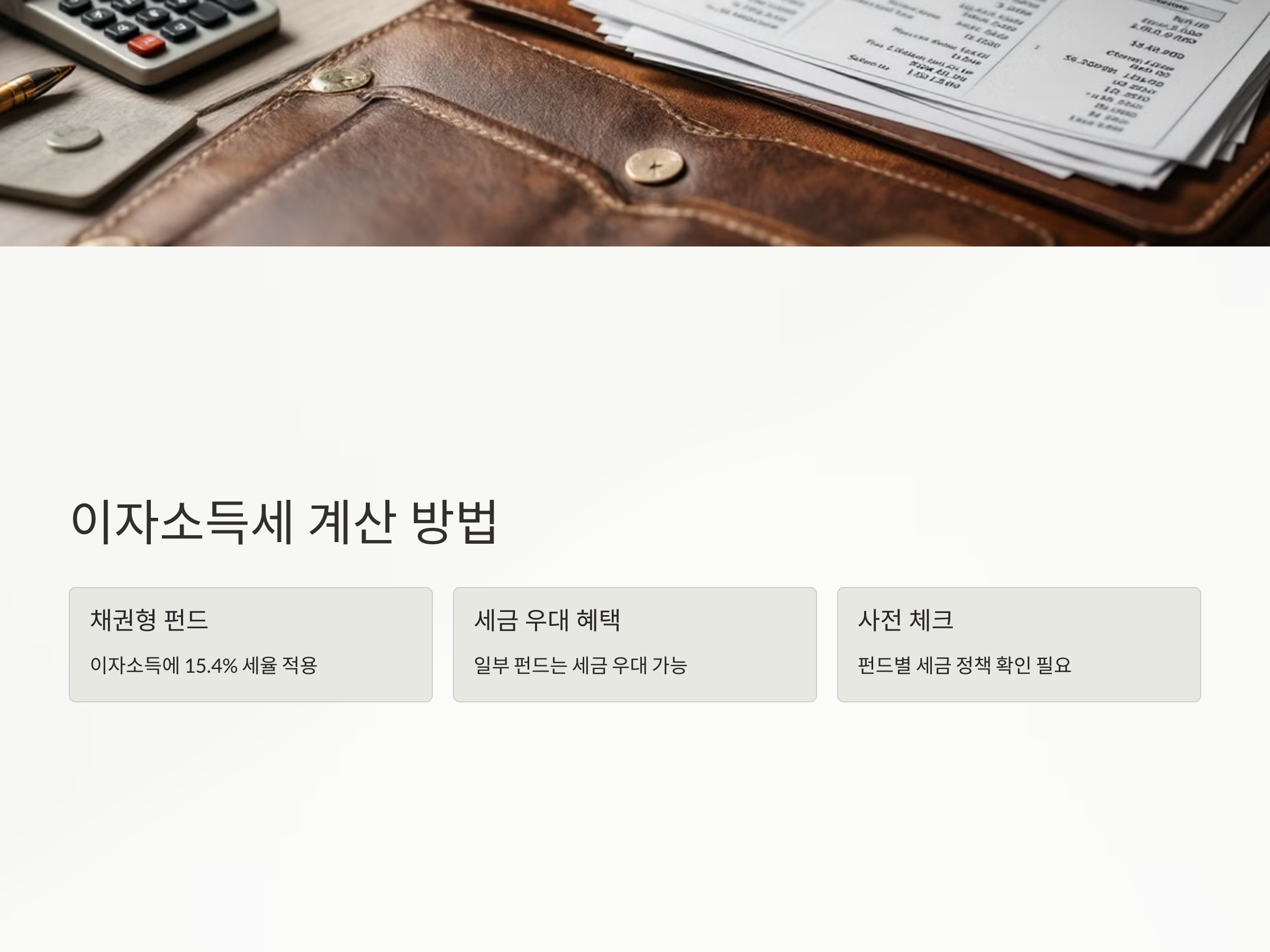 이자소득세는 채권형 펀드에서 발생하는 이자 소득에 대해 부과됩니다. 이자소득은 일정 비율로 세금이 부과되며, 기본적으로 15.4%의 세율이 적용됩니다. 다만, 채권형 펀드 외에도 이자소득이 발생하는 다른 펀드들에도 이자소득세가 적용될 수 있으므로, 해당 펀드의 성격을 이해하고 세금 영향을 미리 점검하는 것이 필요합니다.