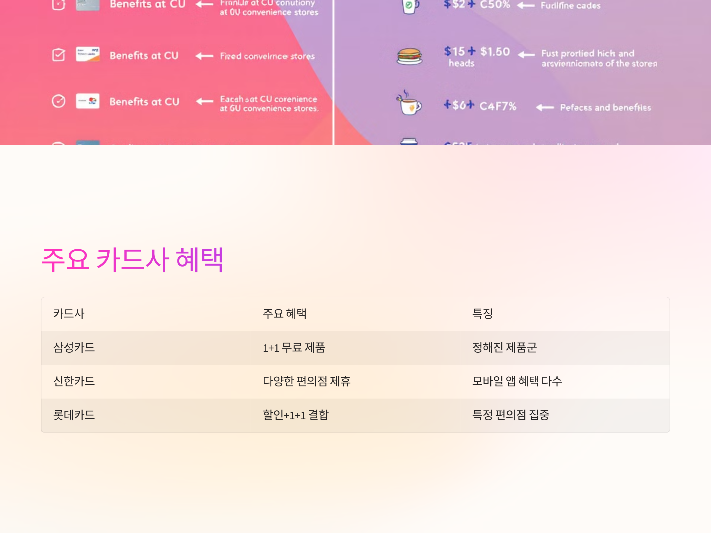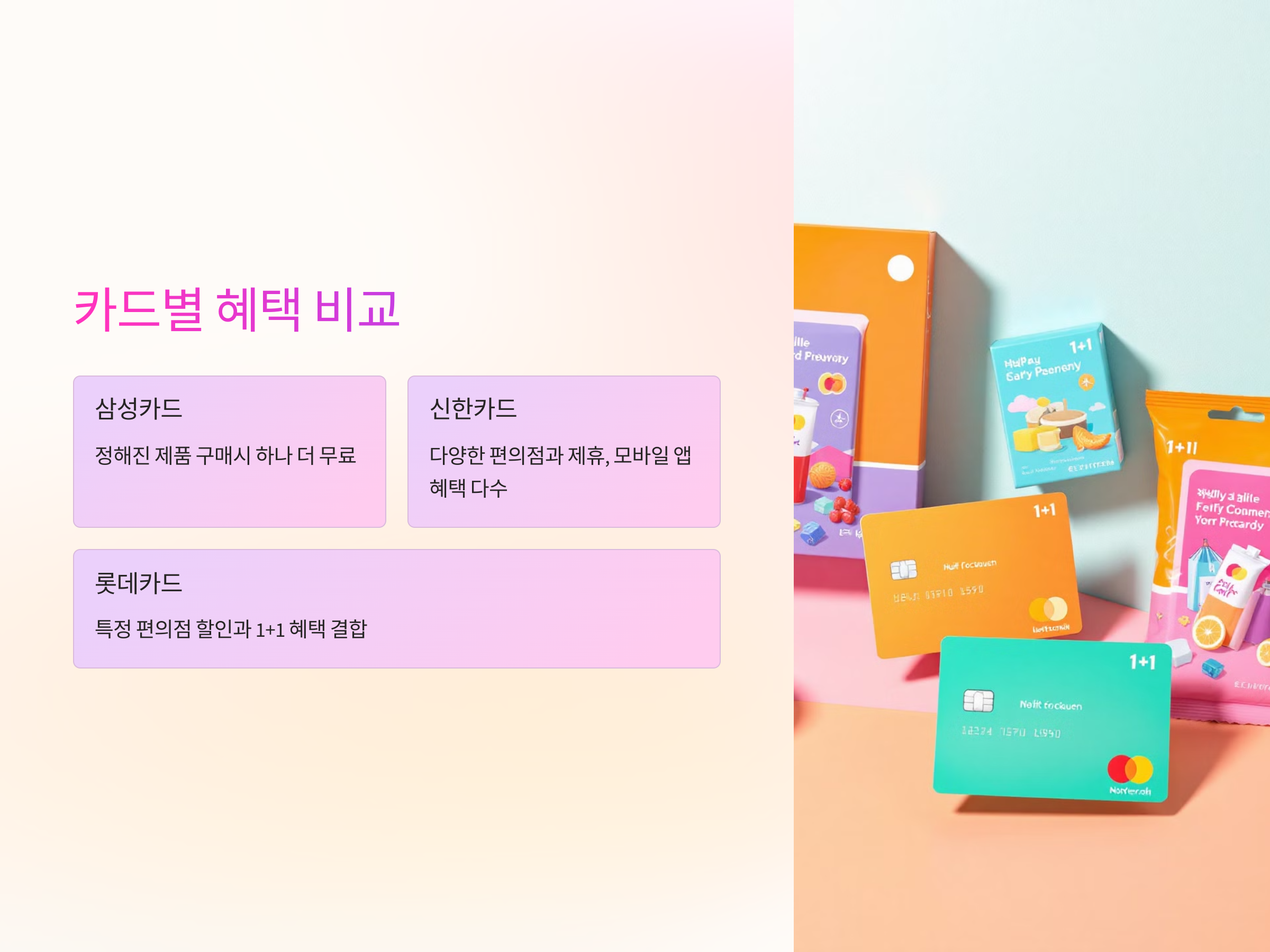 편의점 1+1 카드 혜택은 카드사마다 조금씩 다릅니다. 예를 들어, 특정 카드사에서는 할인율을 적용하거나, 추가적인 1+1 혜택을 제공하기도 합니다. 각 카드사의 제휴 혜택을 잘 확인하고, 자신에게 맞는 카드를 선택하는 것이 중요합니다. 주요 카드사들의 혜택은 아래와 같습니다.