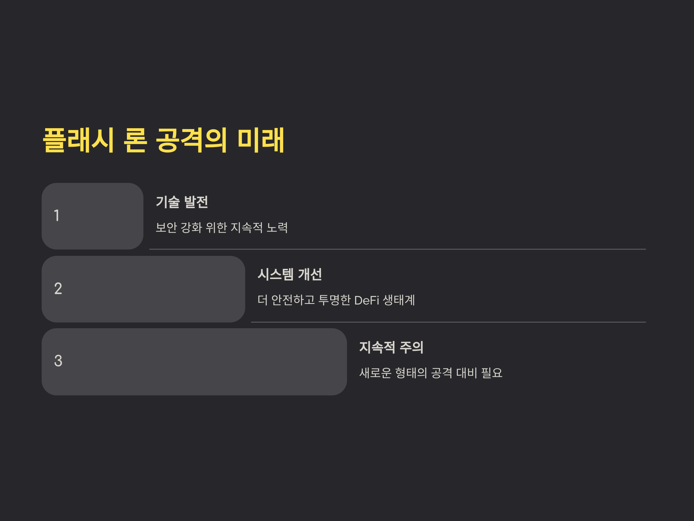 플래시 론 공격은 디파이와 블록체인 기반의 시스템에서 나타나는 새로운 형태의 금융 공격입니다. 이 공격 방식은 그 속도와 예측 불가능성으로 인해 전통적인 금융 시스템에서도 주목받고 있습니다. 하지만 이를 차단하기 위한 기술적 발전과 보안 강화가 이루어져야 하며, 이러한 노력이 계속된다면, 디파이 생태계는 더 안전하고 투명한 시스템으로 발전할 것입니다.