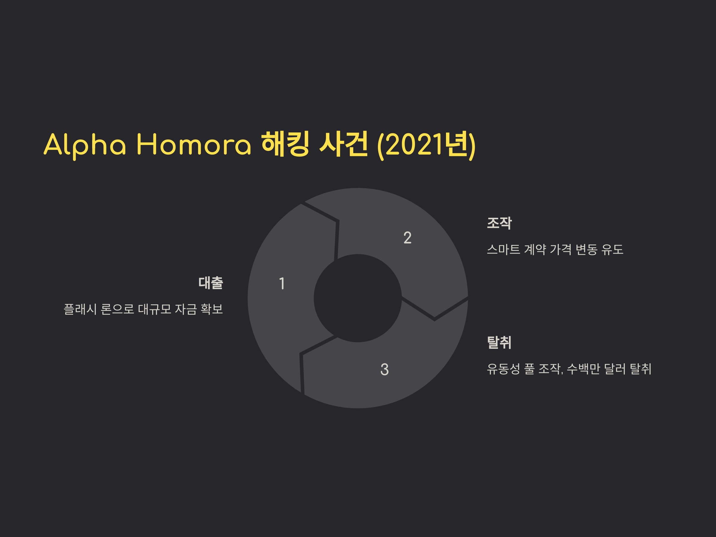 Alpha Homora는 유동성 제공자들에게 높은 수익률을 제공하는 탈중앙화 금융 플랫폼으로 유명했지만, 2021년 초, 플래시 론을 악용한 공격이 발생했습니다. 공격자는 플래시 론을 이용해 큰 자금을 대출받고, 이를 통해 Alpha Homora의 스마트 계약에 가격 변동을 유도했습니다. 이를 통해 공격자는 불법적으로 유동성 풀을 조작하고, 수백만 달러를 탈취한 사례입니다.