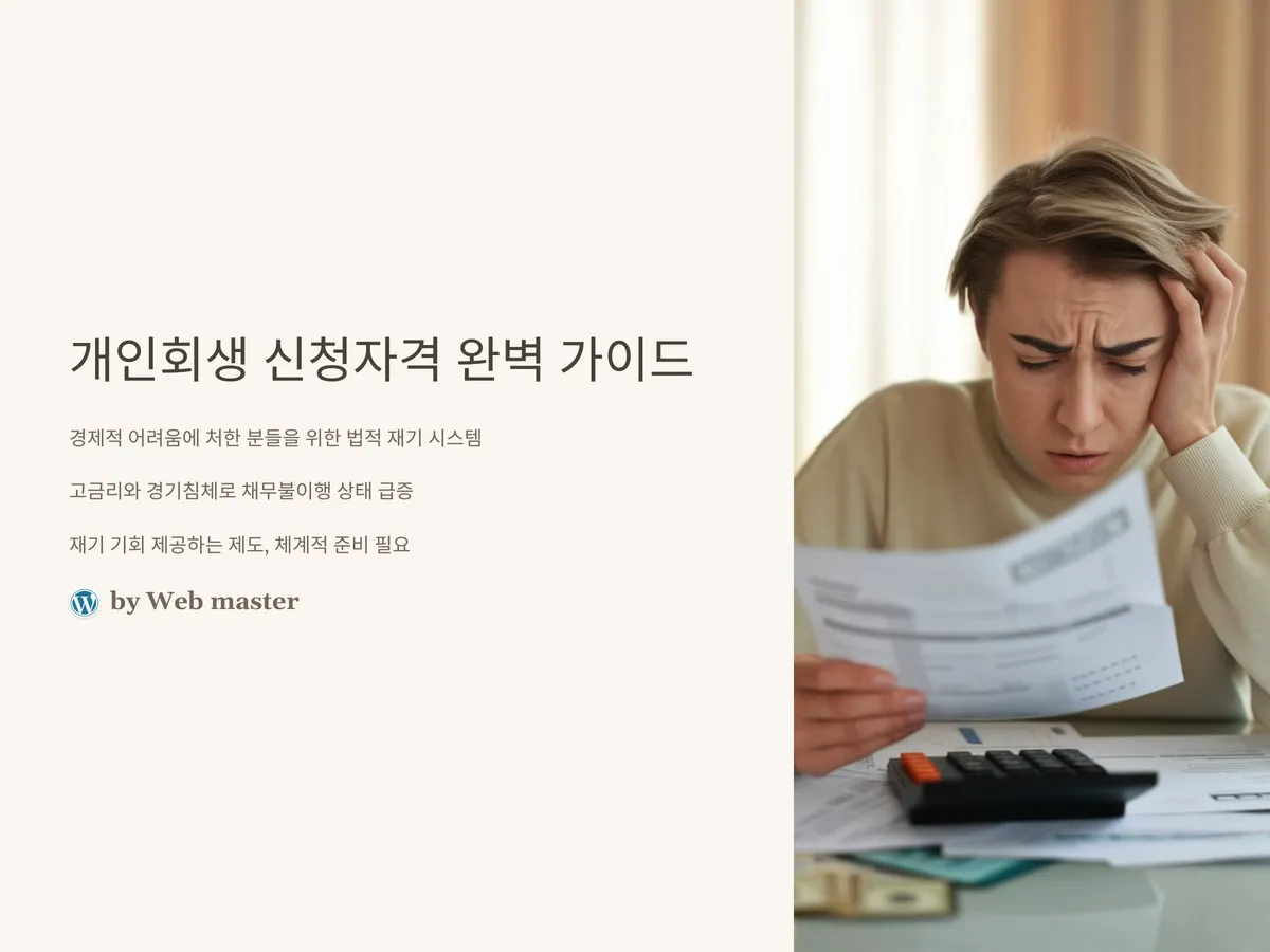 지금 당신의 경제 상황이 벼랑 끝이라면, 그리고 매달 갚아야 할 채무가 숨이 막히게 느껴진다면 '개인회생' 제도를 반드시 검토해봐야 할 시점입니다. 특히 2024년 이후 고금리 지속과 실물 경기 침체로 인해 신용불량이나 채무불이행 상태에 빠진 사람들이 급증하면서 개인회생에 대한 관심도 자연스럽게 높아지고 있습니다. 그러나 법원에서 요구하는 자격 요건은 해마다 조금씩 달라지고 있으며, 최근에는 부정 신청을 걸러내기 위한 심사 강화 경향이 뚜렷합니다. 개인회생은 단순한 채무 탕감 제도가 아닌, 재기의 기회를 제공하는 제도입니다. 따라서 요건을 정확히 파악하고 체계적으로 준비해야만 성공적인 회생 절차를 밟을 수 있습니다.