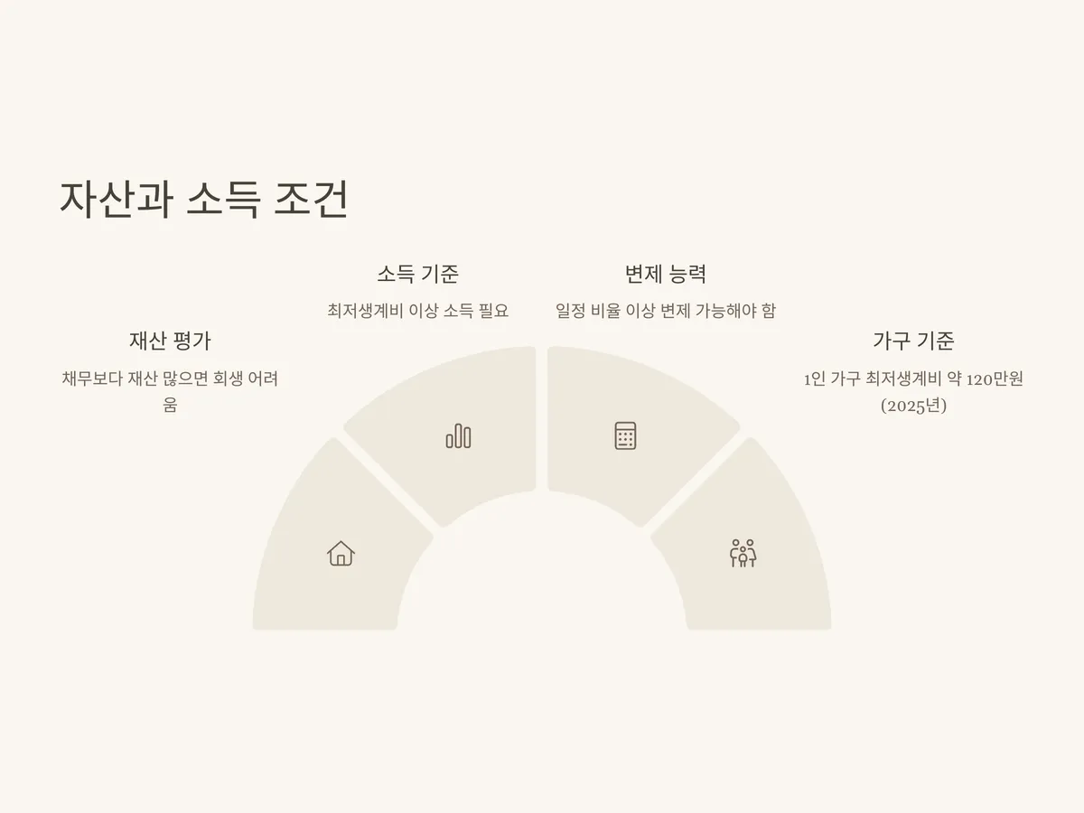 소득의 경우, 최저생계비 이상이어야 하며 나머지 금액으로 일정 비율 이상을 변제할 수 있어야 합니다. 예를 들어, 1인 가구 기준 2025년 최저생계비는 약 120만 원 정도이며, 그 이상 벌어야만 변제가 가능하다고 봅니다. 또한 일정 금액 이상 변제가 가능해야 법원이 채무자의 회생 가능성을 인정합니다.