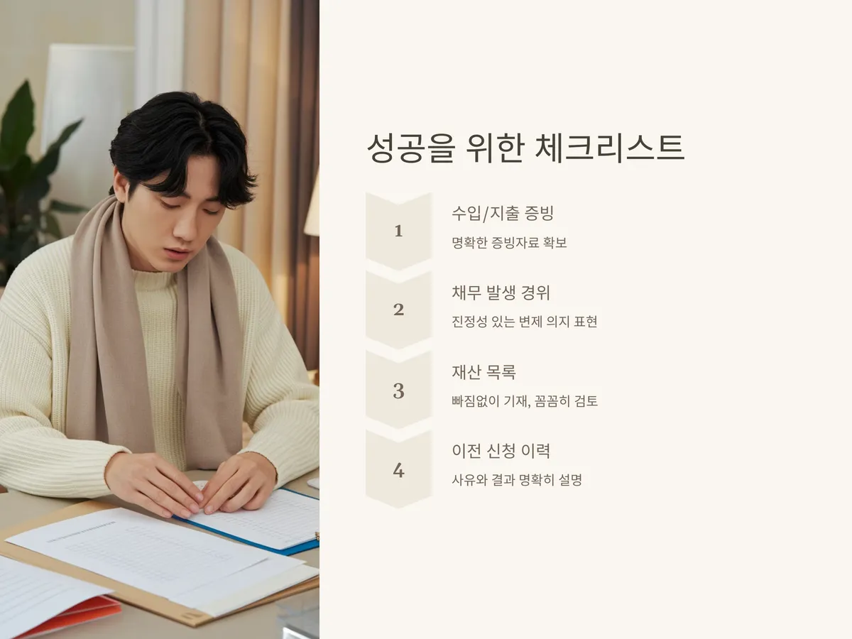 성공적인 개인회생을 위해서는 다음과 같은 사항을 철저히 준비해야 합니다. 첫째, 수입과 지출 내역을 명확하게 증빙할 수 있어야 하며, 소득이 현금 위주라면 통장 거래내역서 등 간접적인 증거를 확보해야 합니다. 둘째, 채무의 발생 경위와 변제 의지를 진정성 있게 표현하는 것이 중요합니다.