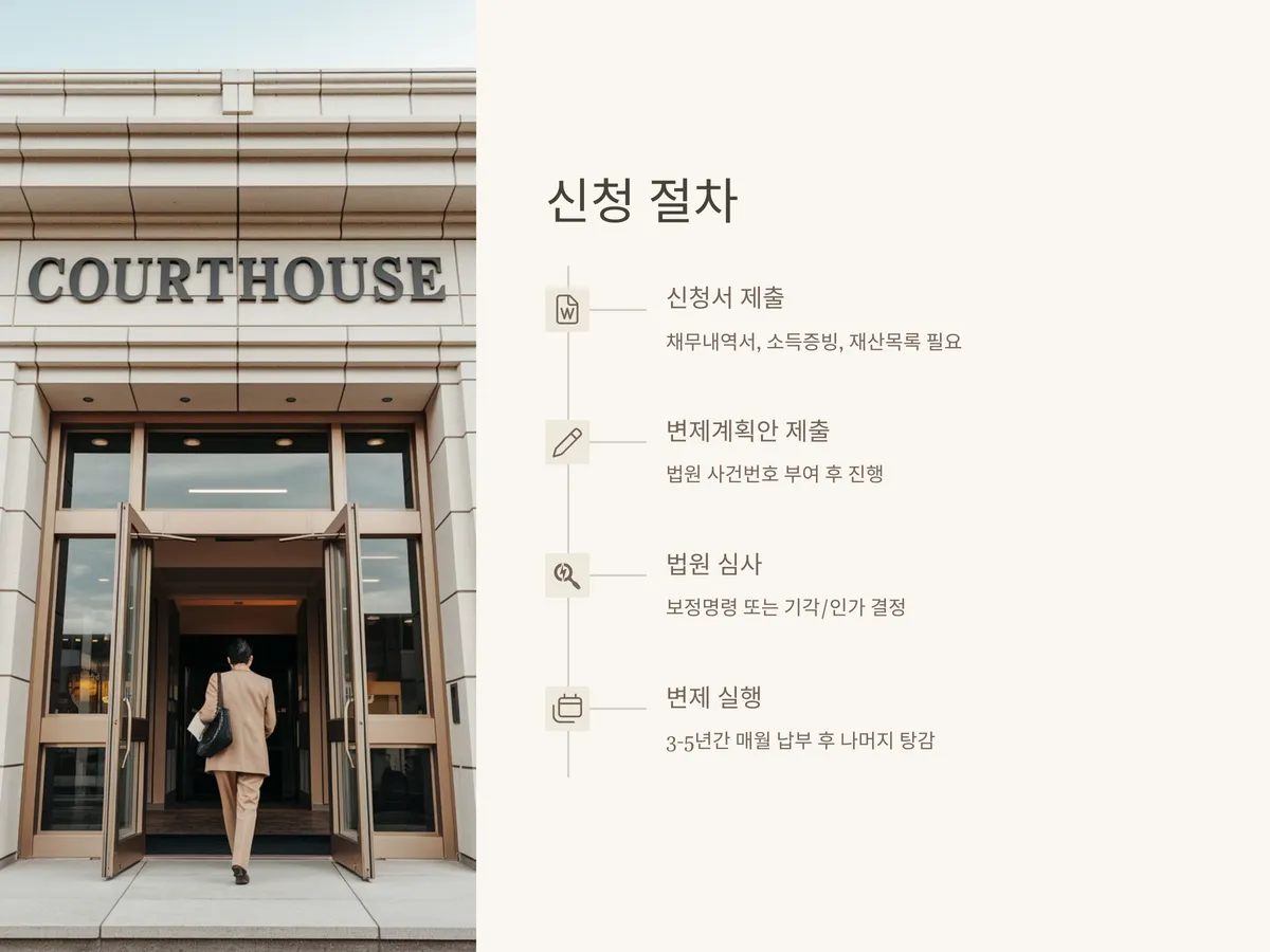 법원은 변제계획안을 검토한 뒤 보정 명령을 내리거나 기각/인가 결정을 내립니다. 통상적으로 신청부터 인가까지는 약 6개월 정도의 기간이 소요되며, 인가 후에는 3년~5년 동안 매월 일정 금액을 납부하게 됩니다. 이 기간 동안 성실히 납부한 경우, 나머지 채무는 탕감됩니다.