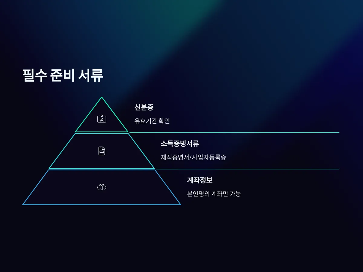 당일 대출을 위해 가장 중요한 것은 '완벽한 서류 준비'입니다. 일반적으로 필요한 서류는 신분증, 재직증명서 또는 소득확인서류, 그리고 계좌정보입니다. 만약 직장인이 아니라면 프리랜서나 자영업자의 경우, 사업자등록증과 세금신고내역이 추가로 요구될 수 있습니다.