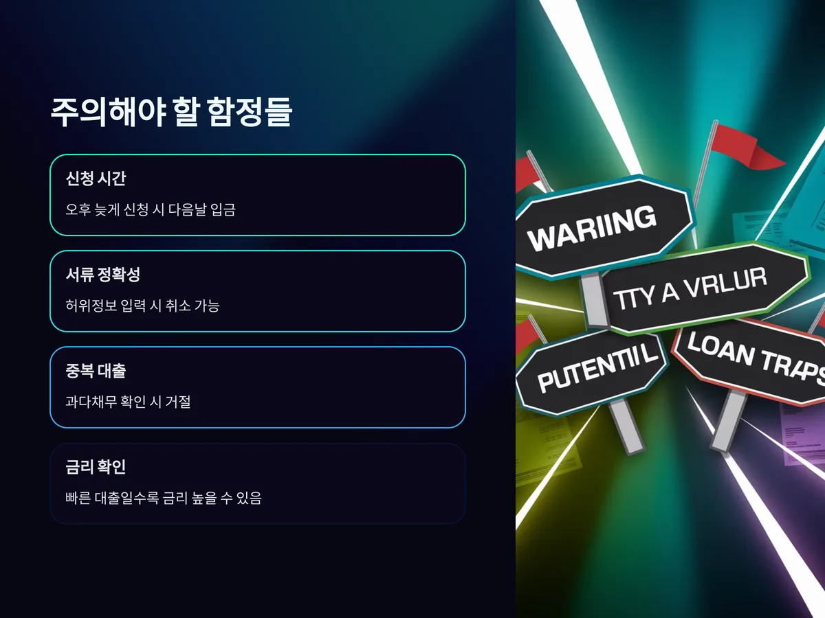 또한, 서류에 허위 정보가 들어가거나 중복 대출로 인한 ‘과다채무’가 확인되면 신청이 취소될 수 있으니 신중하게 작성해야 합니다. 최근에는 보험사나 카드사 연계 상품 중에서도 당일 대출이 가능한 경우가 있어 대안으로 고려해보는 것도 좋습니다. 단, 이 경우는 금리가 다소 높게 책정될 수 있다는 점도 감안해야 합니다.
