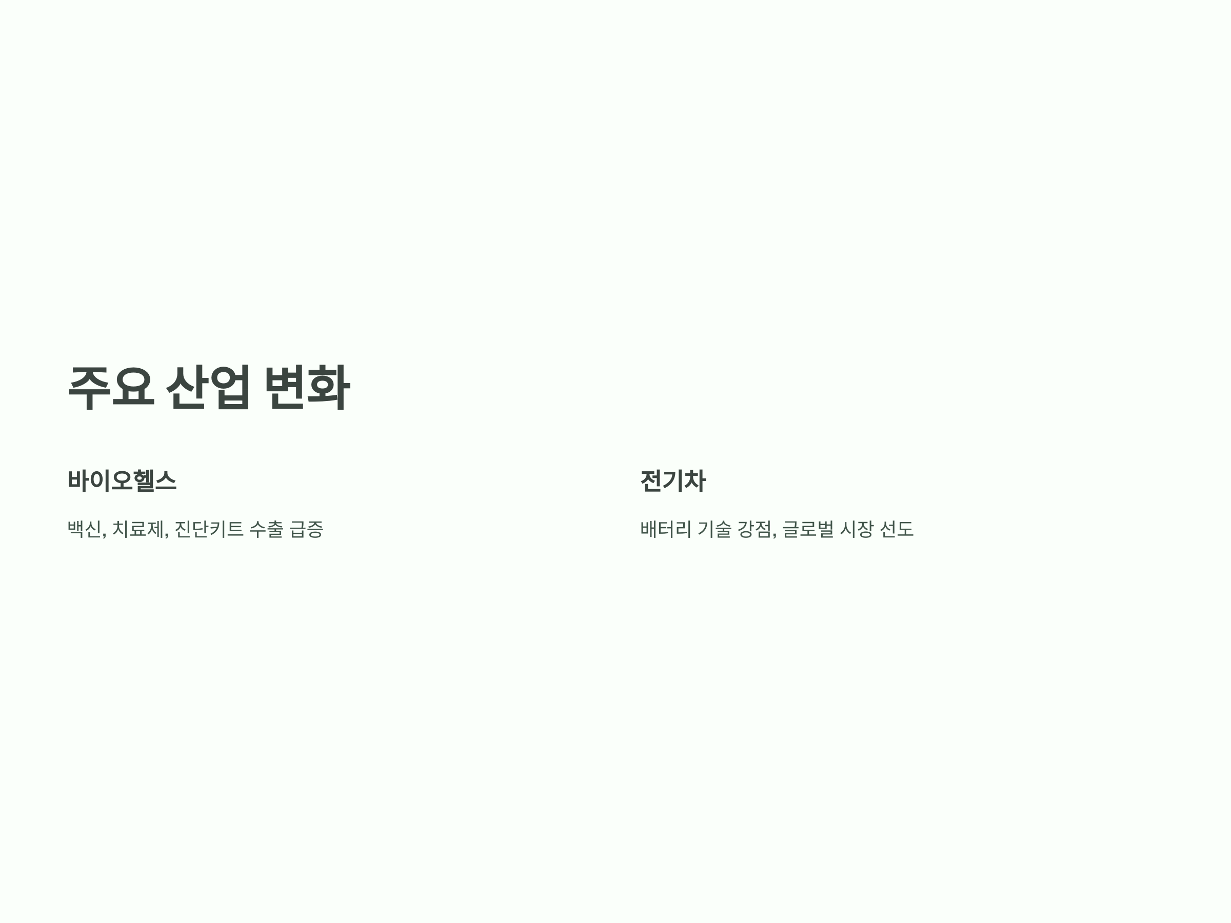 - 과거 철강, 자동차, 반도체 위주였으나, 최근 친환경 기술, 5G, 바이오헬스 분야에서 수출이 증가하고 있습니다.