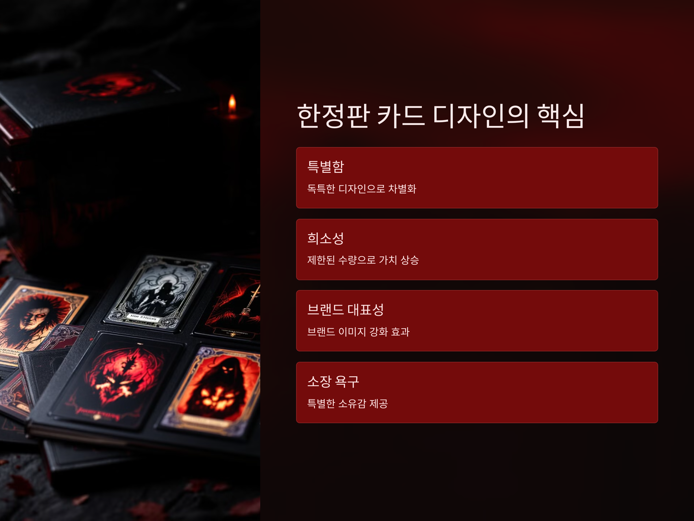 한정판 카드 디자인은 특별함과 희소성을 강조하는 작업입니다. 카드의 디자인이 독특하고 차별화될수록 그 가치는 상승하며, 소장 욕구를 자극합니다. 한정판 카드의 디자인은 그 자체로 브랜드를 대표하는 중요한 요소로 작용하며, 카드를 소유한 사람들에게 특별한 경험을 선사합니다. 이를 위해서는 색상, 형태, 아트워크, 질감 등 모든 디자인 요소가 잘 조화를 이루어야 하며, 기능성과 특수 효과 또한 적절히 활용되어야 합니다.