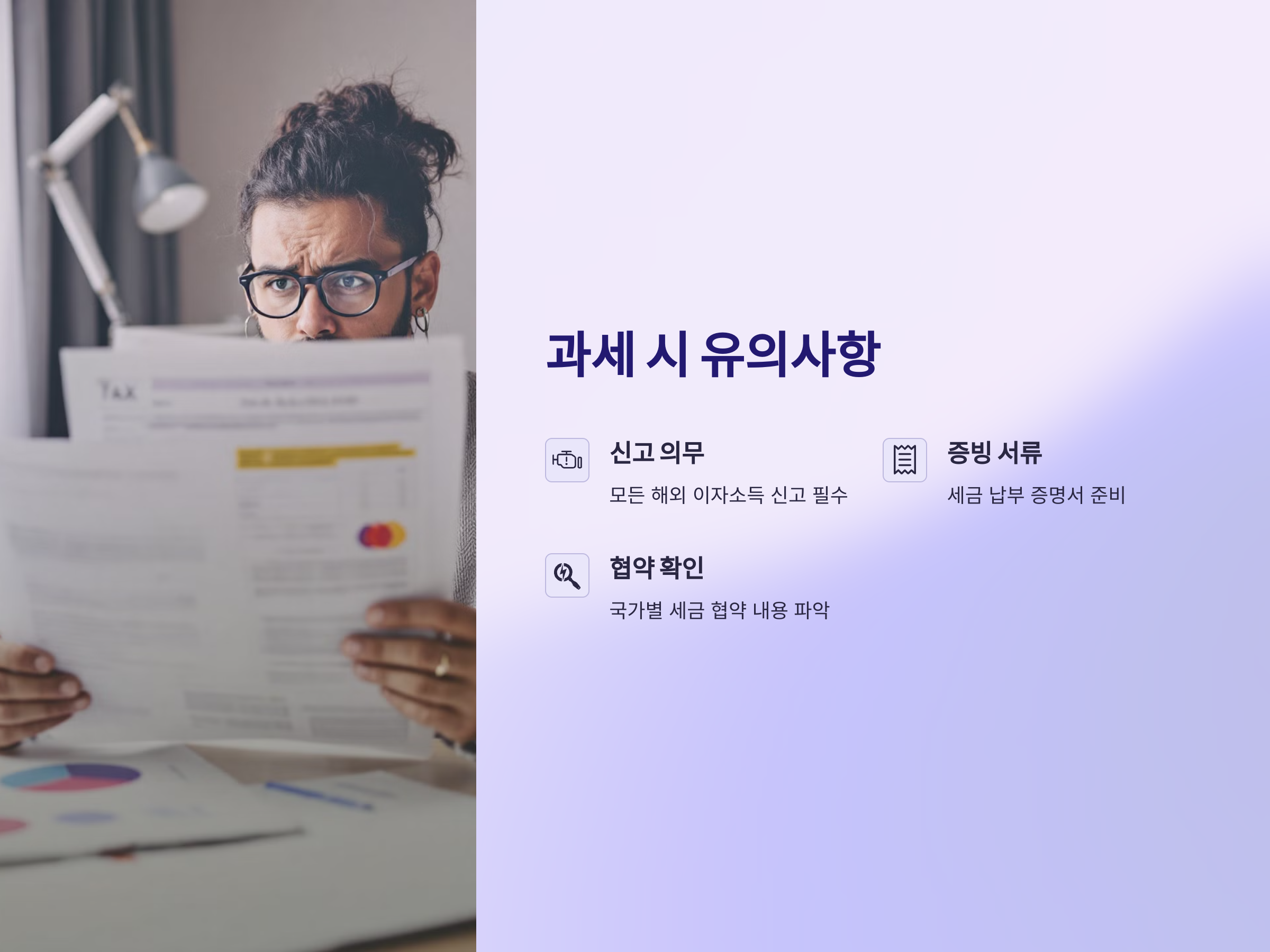 해외에서 얻은 이자소득에 대해 과세될 때 유의해야 할 점은 여러 가지가 있습니다. 첫째, 해외에서 발생한 이자소득을 반드시 신고해야 한다는 점입니다. 신고를 하지 않거나 신고 금액을 잘못 기재하면 세금 문제가 발생할 수 있습니다. 둘째, 해외에서 세금을 납부한 증빙 서류를 준비해야 합니다. 세액 공제를 받기 위해서는 해외에서 납부한 세금을 입증할 수 있는 서류가 필수적입니다.