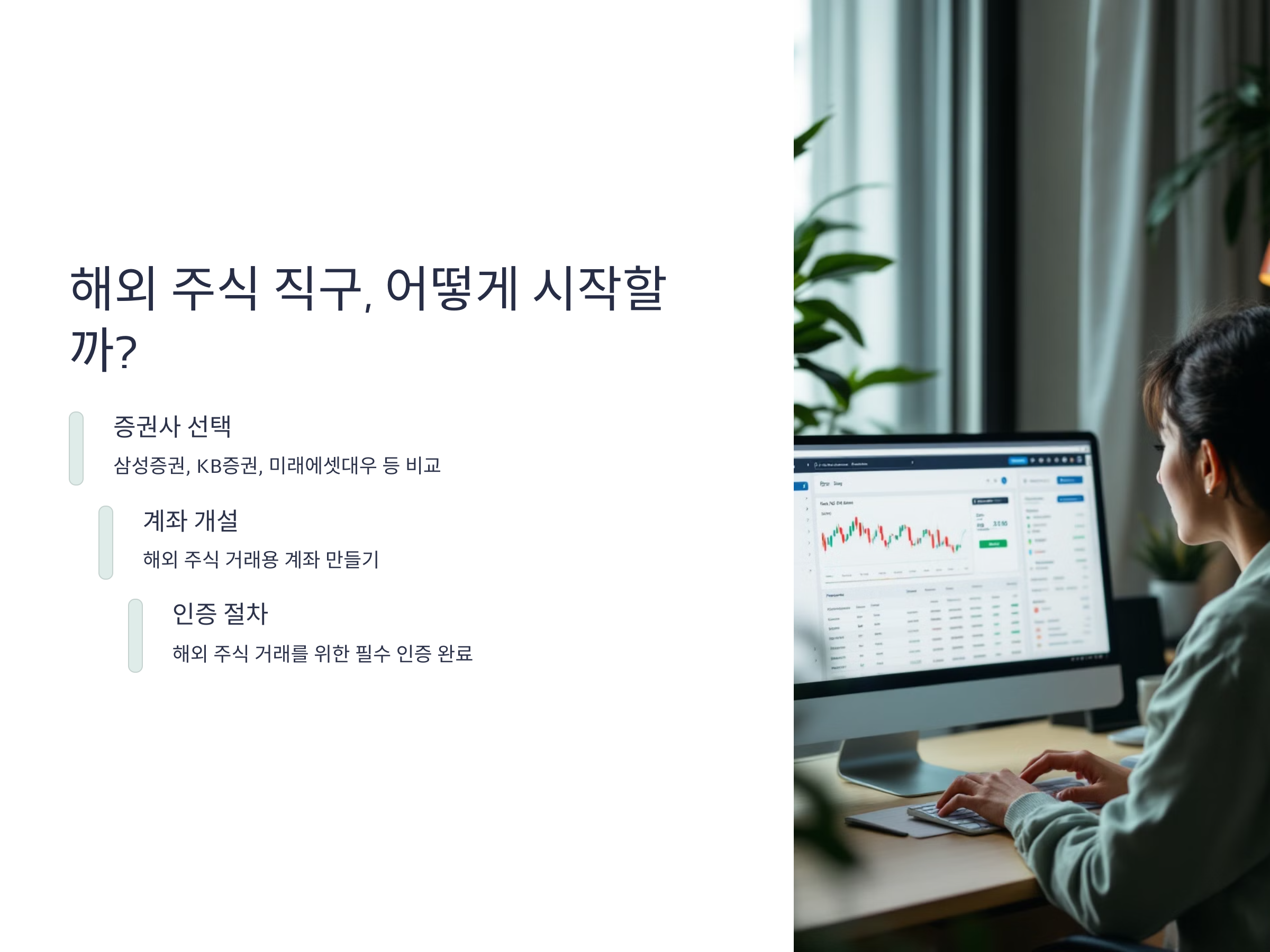 해외 주식을 거래하려면 먼저 해외 주식 거래가 가능한 증권사에 계좌를 개설해야 합니다. 현재 국내 많은 증권사들이 해외 주식 거래 서비스를 제공하고 있어, 거래 플랫폼을 선택하는 데 어려움은 없을 것입니다. 예를 들어, 삼성증권, KB증권, 미래에셋대우 등에서 해외 주식 직구 서비스를 제공하고 있습니다.