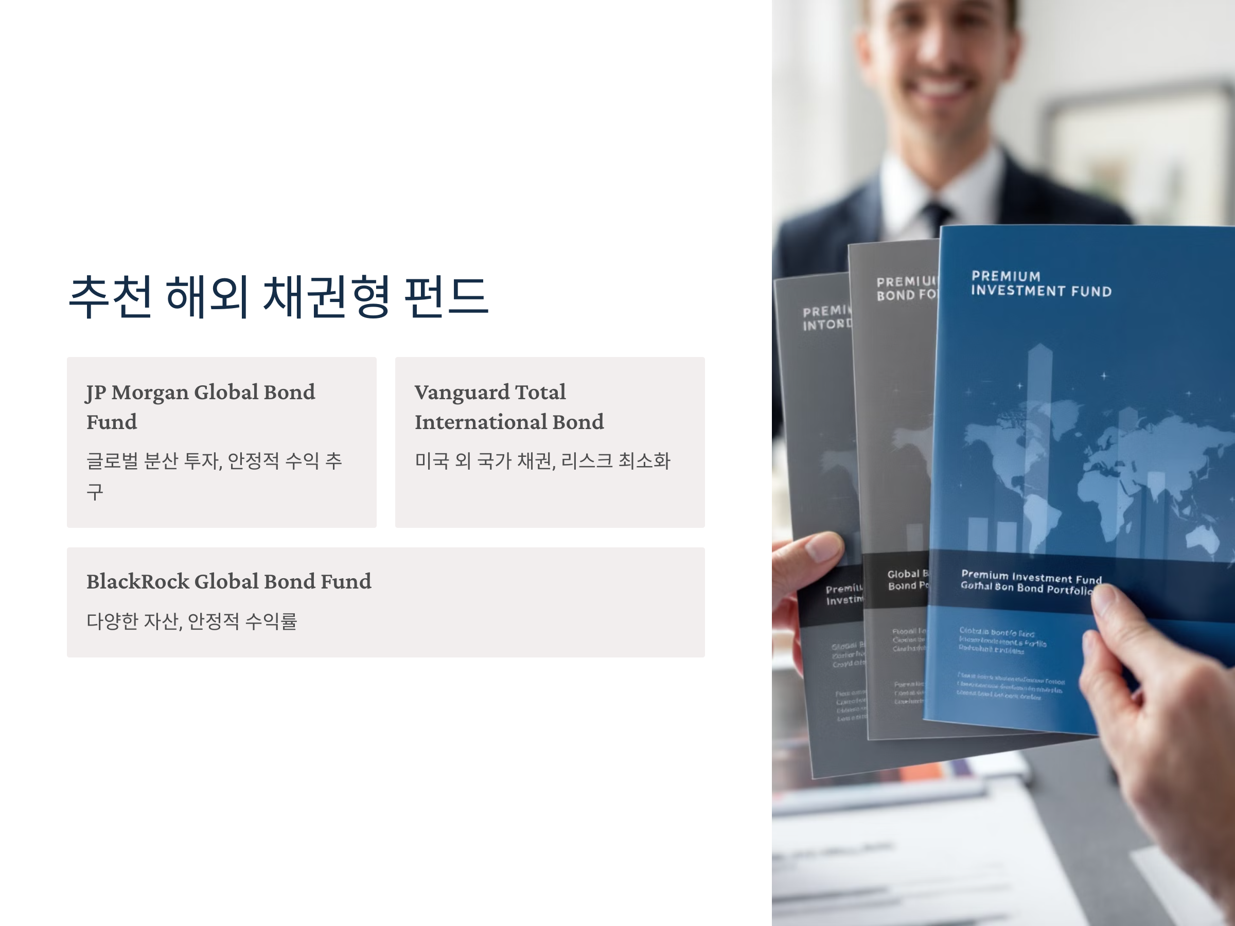또한, 해외 채권형 펀드는 안정적인 수익을 제공하는 경우가 많습니다. 특히 금리가 낮거나 경제 불확실성이 높은 상황에서는 안정적인 투자처로 각광받습니다. 많은 해외 채권형 펀드는 금리가 일정하게 유지되거나 소폭 상승하는 경우에도 꾸준한 수익을 올릴 수 있기 때문에 장기 투자에 적합합니다.
