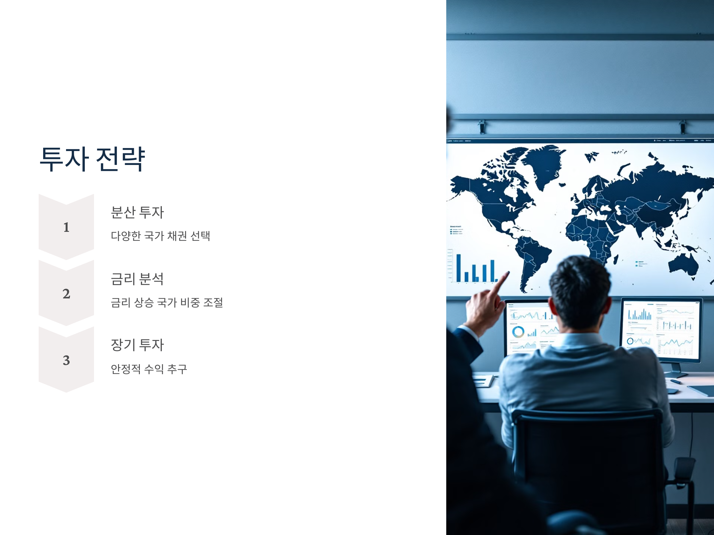 해외 채권형 펀드에 투자할 때는 분산 투자가 가장 중요한 전략입니다. 한 국가나 지역에 집중하지 않고, 다양한 국가의 채권에 분산 투자함으로써 리스크를 줄일 수 있습니다. 또한, 금리가 상승할 가능성이 있는 국가의 채권에 비중을 두고, 금리가 낮을 것으로 예상되는 국가에는 상대적으로 적은 비중을 두는 전략을 사용할 수 있습니다.
